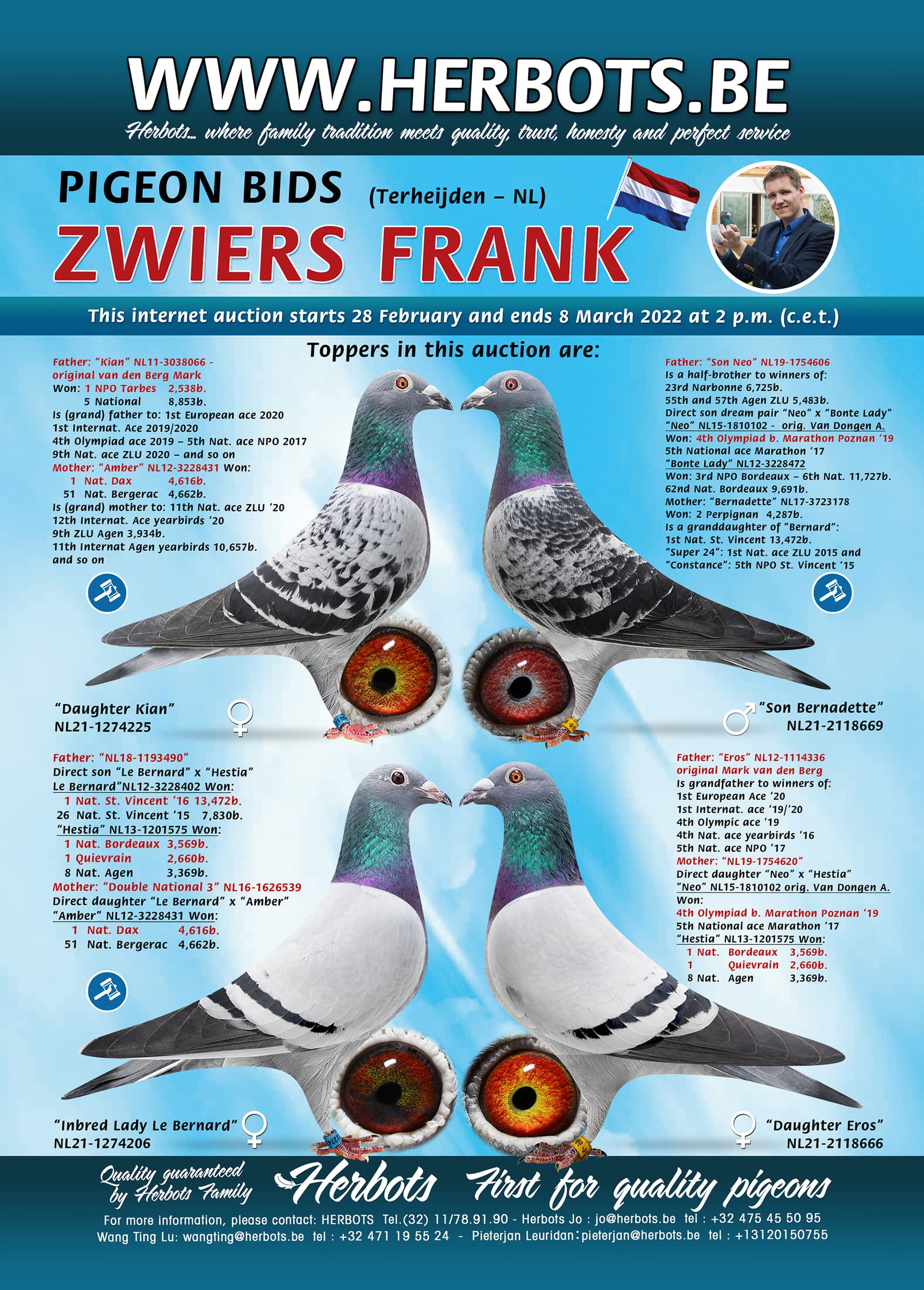 Tuesday 8 December at 2 p.m. ends an unique internet auction where Frank offers strictly selected pigeons born from the very best of his breeding loft.