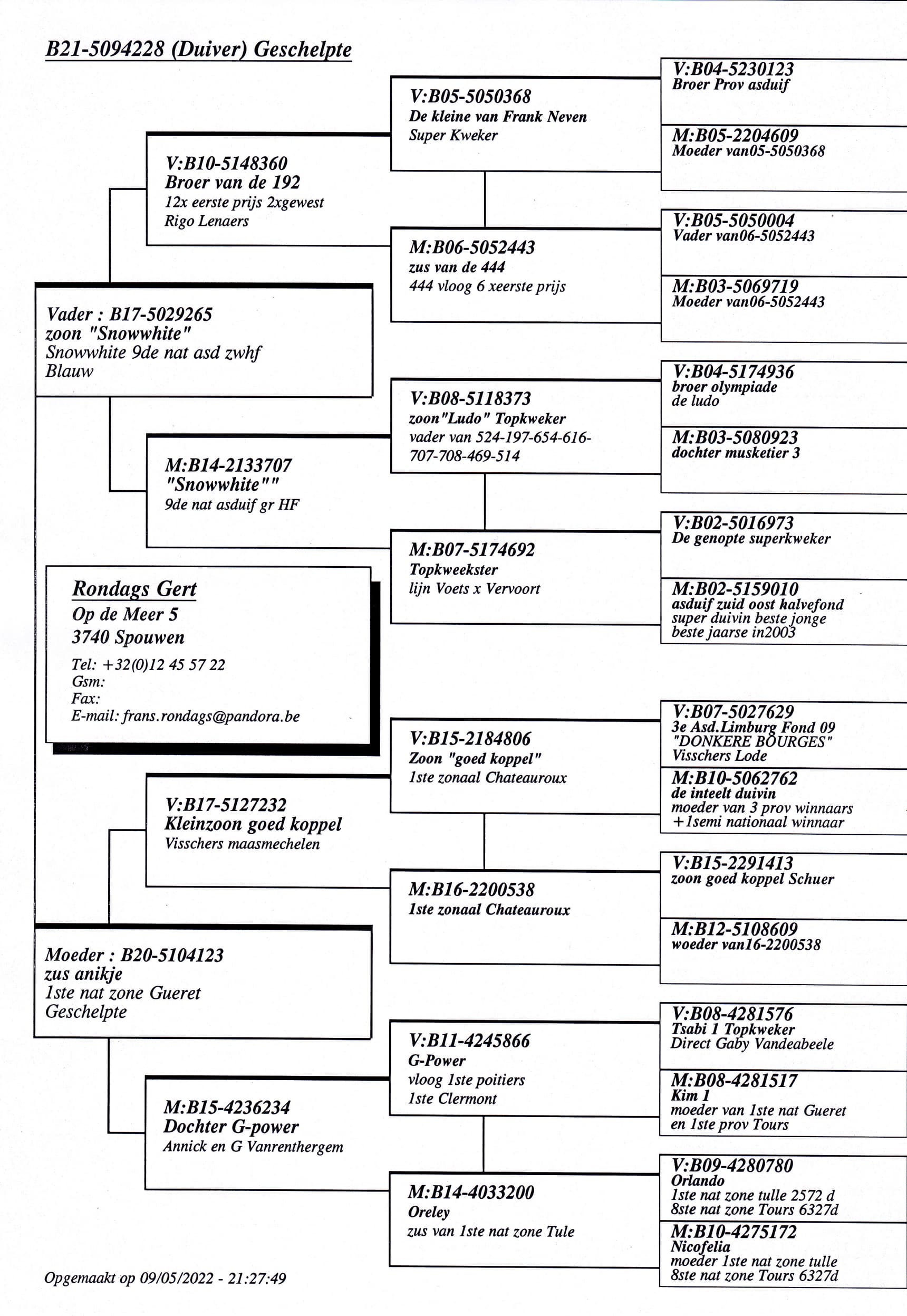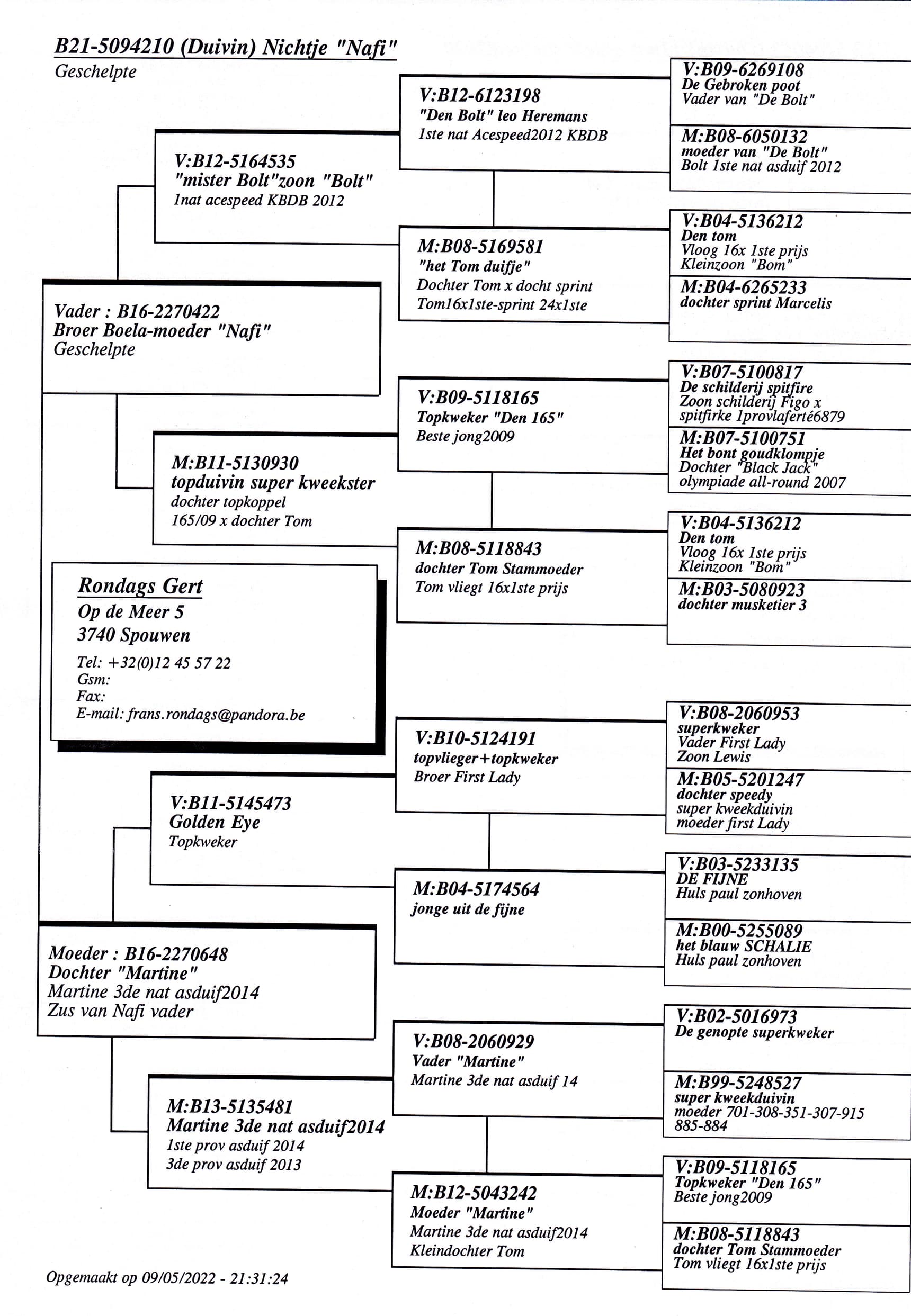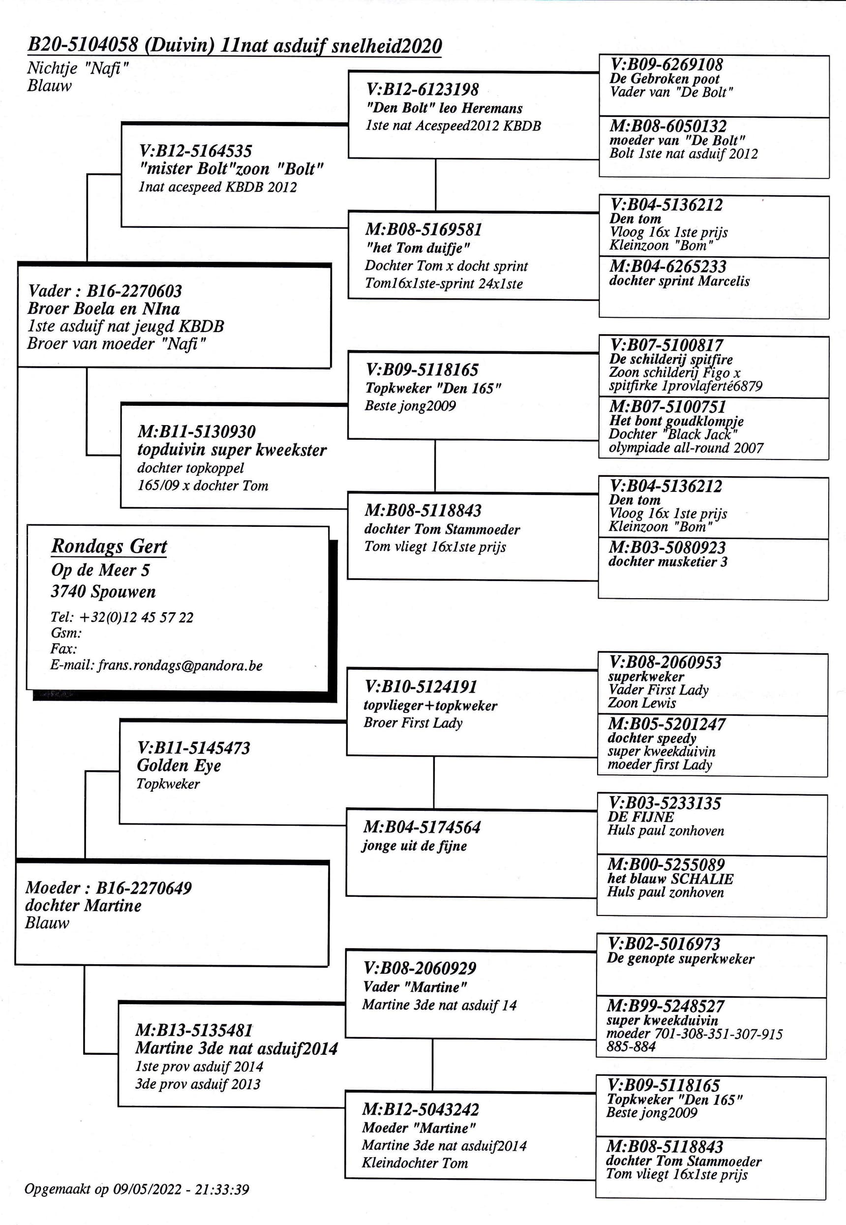 We all know the colony of Frans & Gert Rondags, preferably these pigeons have a headwind and hard competitions to shine. Last weekend it was so far and it was a party at the Rondags house with 1-2-3-4-5 Dizy against 2,773 pigeons and 1-2-3 Sourdun against 1,919 pigeons. Top class again thanks to the line of “Boela” – “Nina” – “Nafi” and the contribution of the pigeons from Dominique Velghe. You will notice that most pigeons are all linked to the basic pigeons of this colony, which have already produced several national ace pigeons.