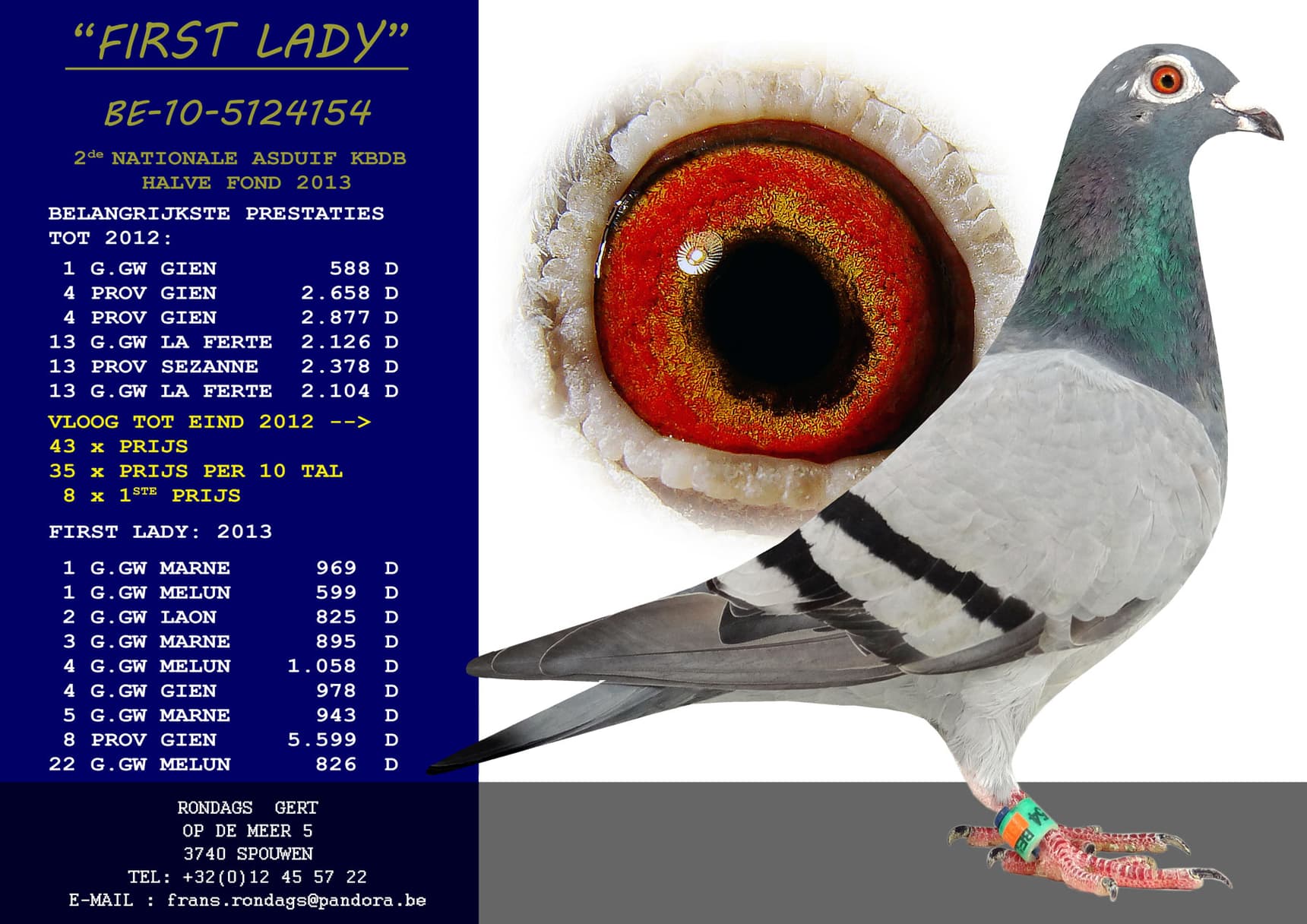 The following ace bird from the past is “First Lady”, BE 10-5124154 “First Lady”. She won 8x 1st and 2nd National Ace bird Middle Distance old KBDB 2013. She won ao: 1 Marne 969b – 1 Melun 599b – 1 Laon 212b – 1 Melun 167b – 1 La Ferte 88b - 1 Chimay 70b – 1 Chimay 43b – 1 Chimay 29b - 3 Marne 895b – 3 La Ferte 300b - 4 Prov Gien 2,877b ( 1-538b local ) – 4 Prov Gien 2,658b ( 1-466b local ) – 4 Prov Sezanne 2,378b - 5 Marne 943b - 8 Prov Gien 5,599b