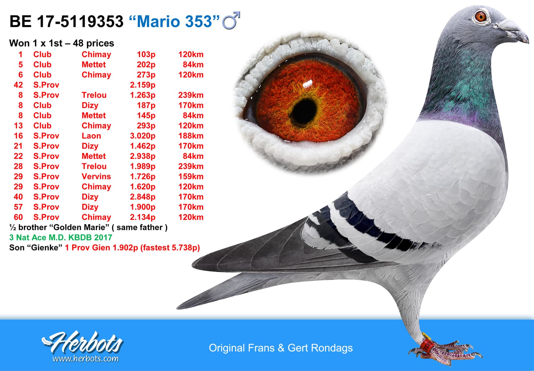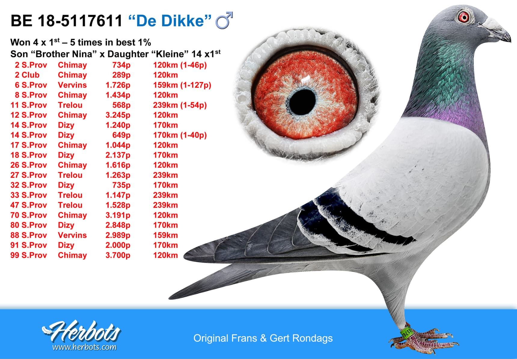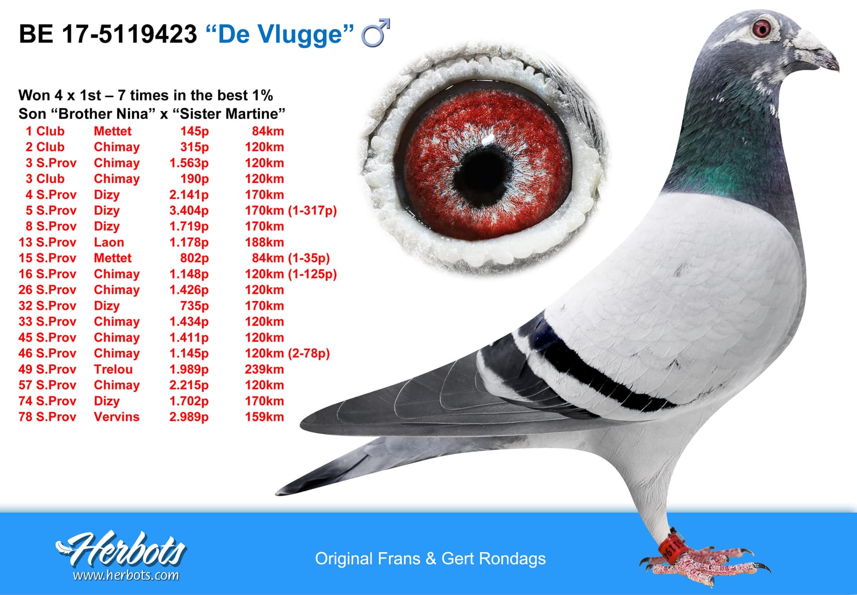 He is a son to “Brother Nina” ( Grandson Bolt 1st Nat Ace bird short distance KBDB 2012 Leo Heremans – Grandson “165” Inbred Figo ) x “Super Duifje 135” Won 3 x 1st and 51 prizes in total. She is a daughter to “De Kleine” 14 x 1st with a sister to “First Lady” 2 Nat Ace bird Middle Distance KBDB 2013.