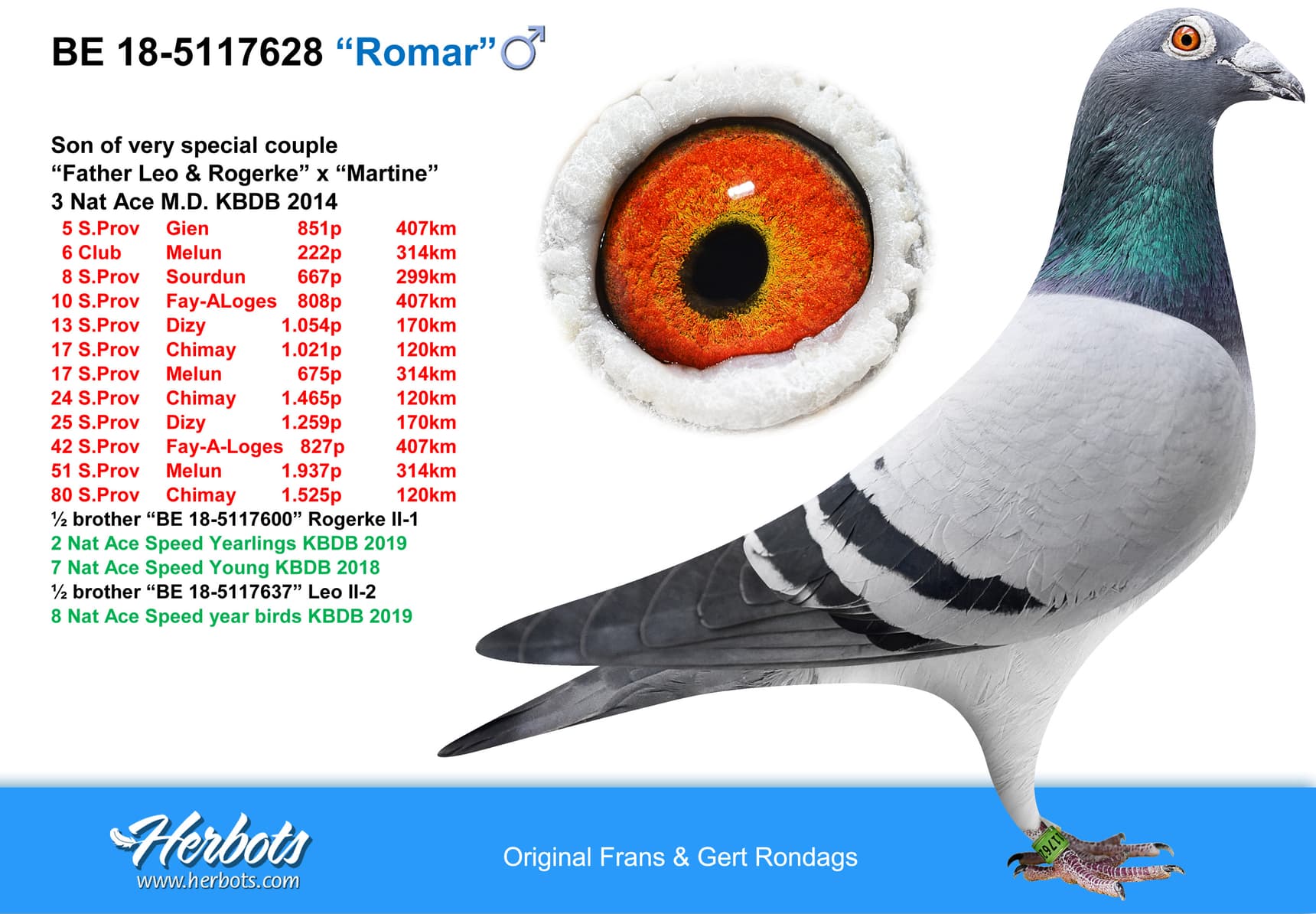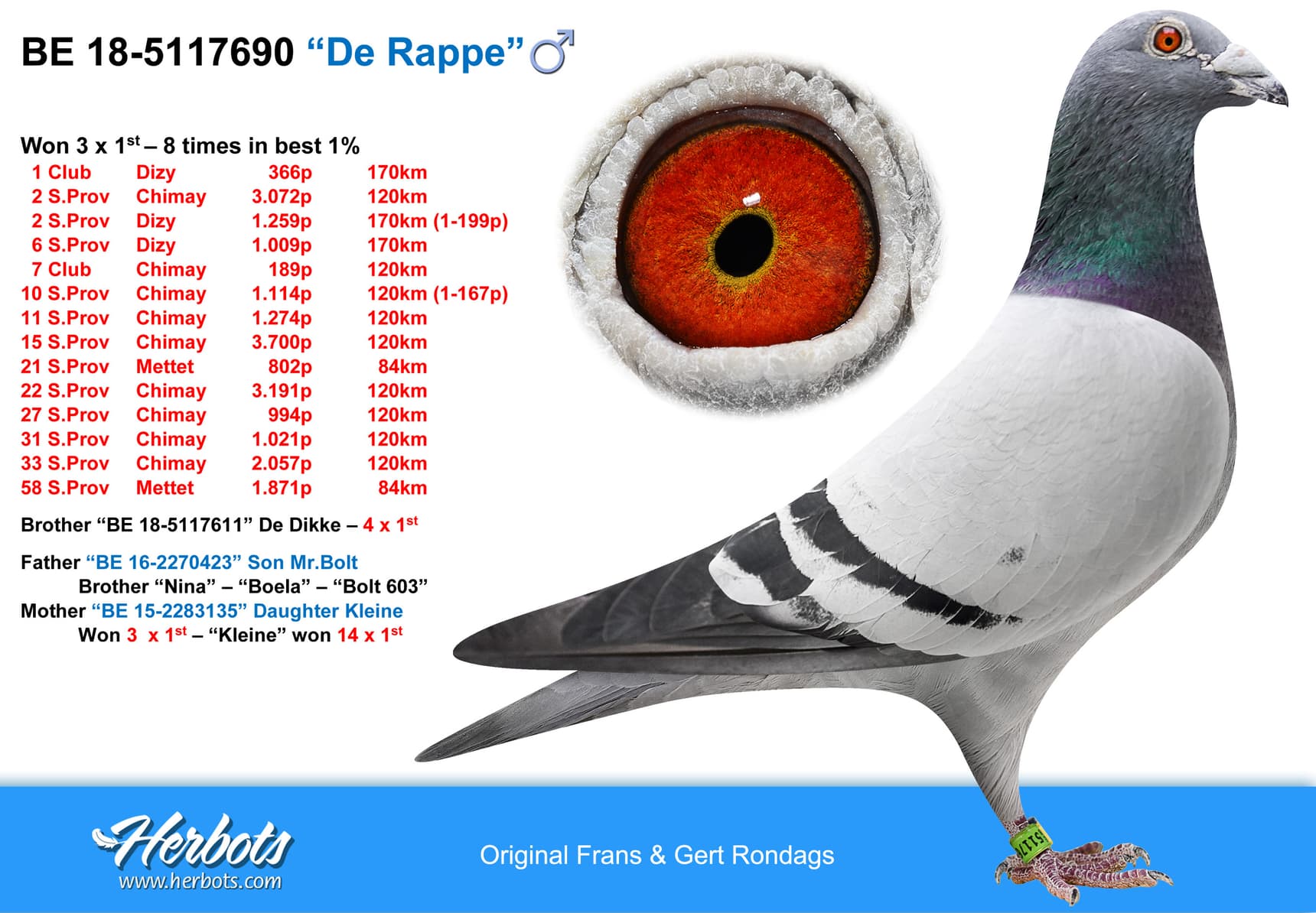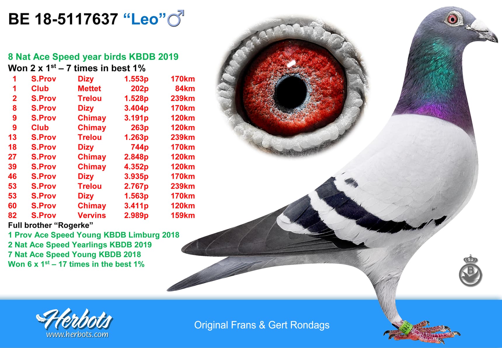 He is a son to “Brother Nina” ( Grandson Bolt 1st Nat Ace bird short distance KBDB 2012 Leo Heremans – Grandson “165” Inbred Figo ) x “Super Duifje 135” Won 3 x 1st and 51 prizes in total. She is a daughter to “De Kleine” 14 x 1st with a sister to “First Lady” 2 Nat Ace bird Middle Distance KBDB 2013.