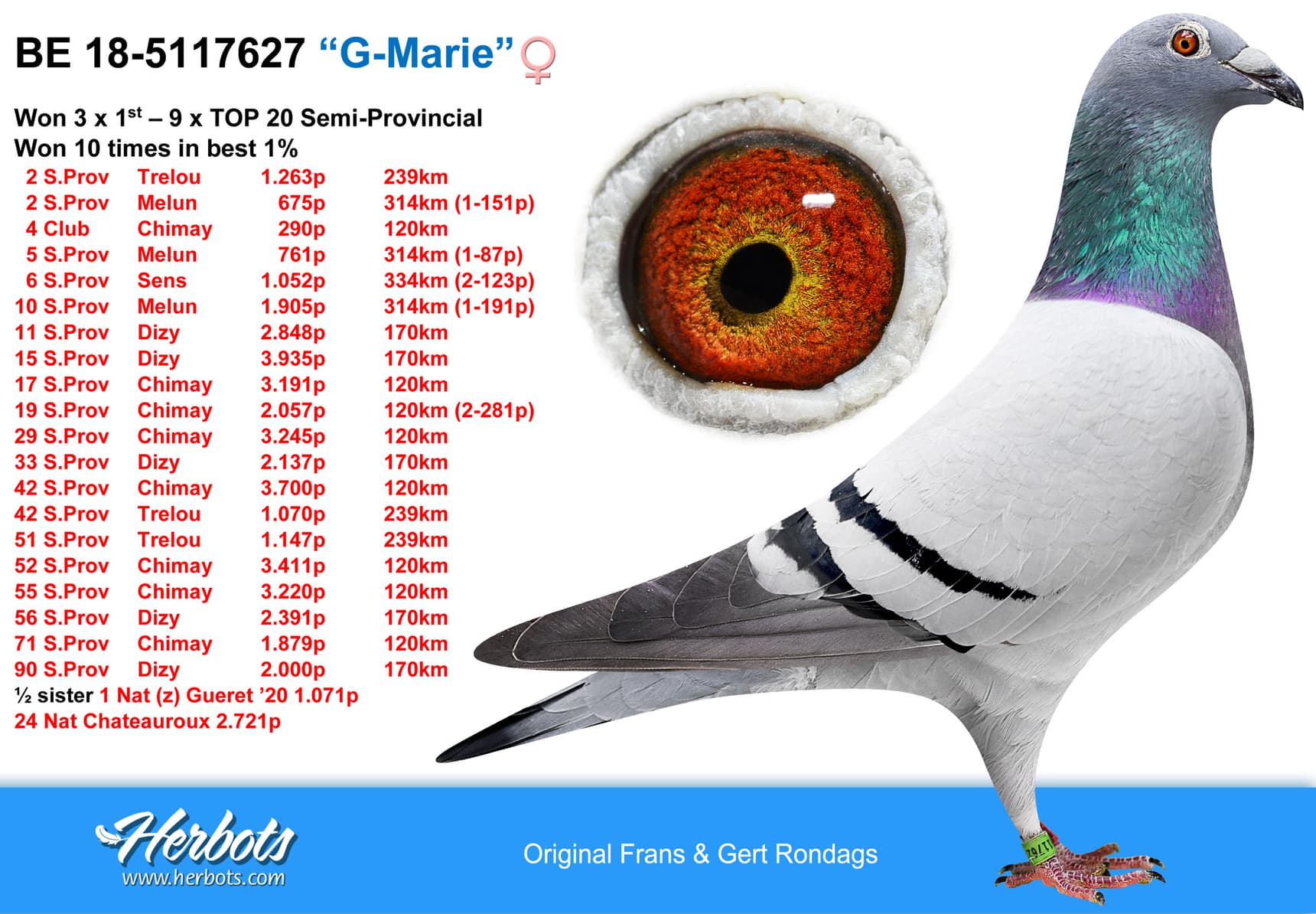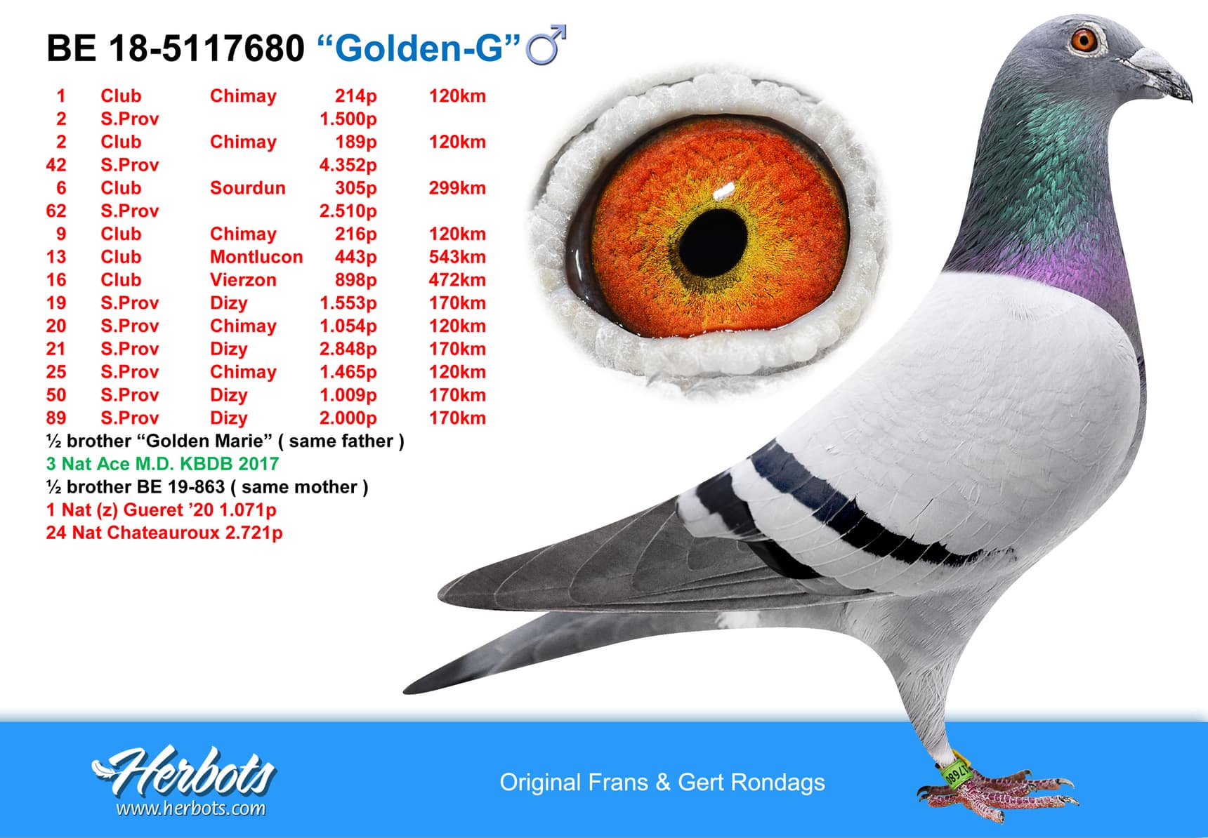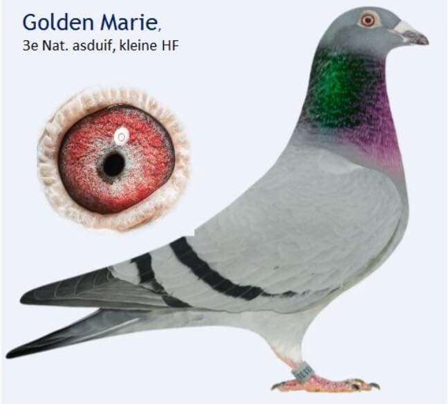 The father to “Golden Marie” was coupled to “Daughter G-Power” who was the best breeding hen on the Rondags loft on the national races and became already mother to 1st Nat (z) Gueret 1,071b – 24 Nat Chateauroux 2,721b and grandmother to 7 Nat Chateauroux 2,721b
