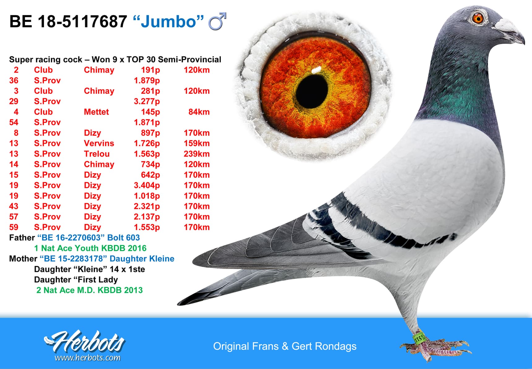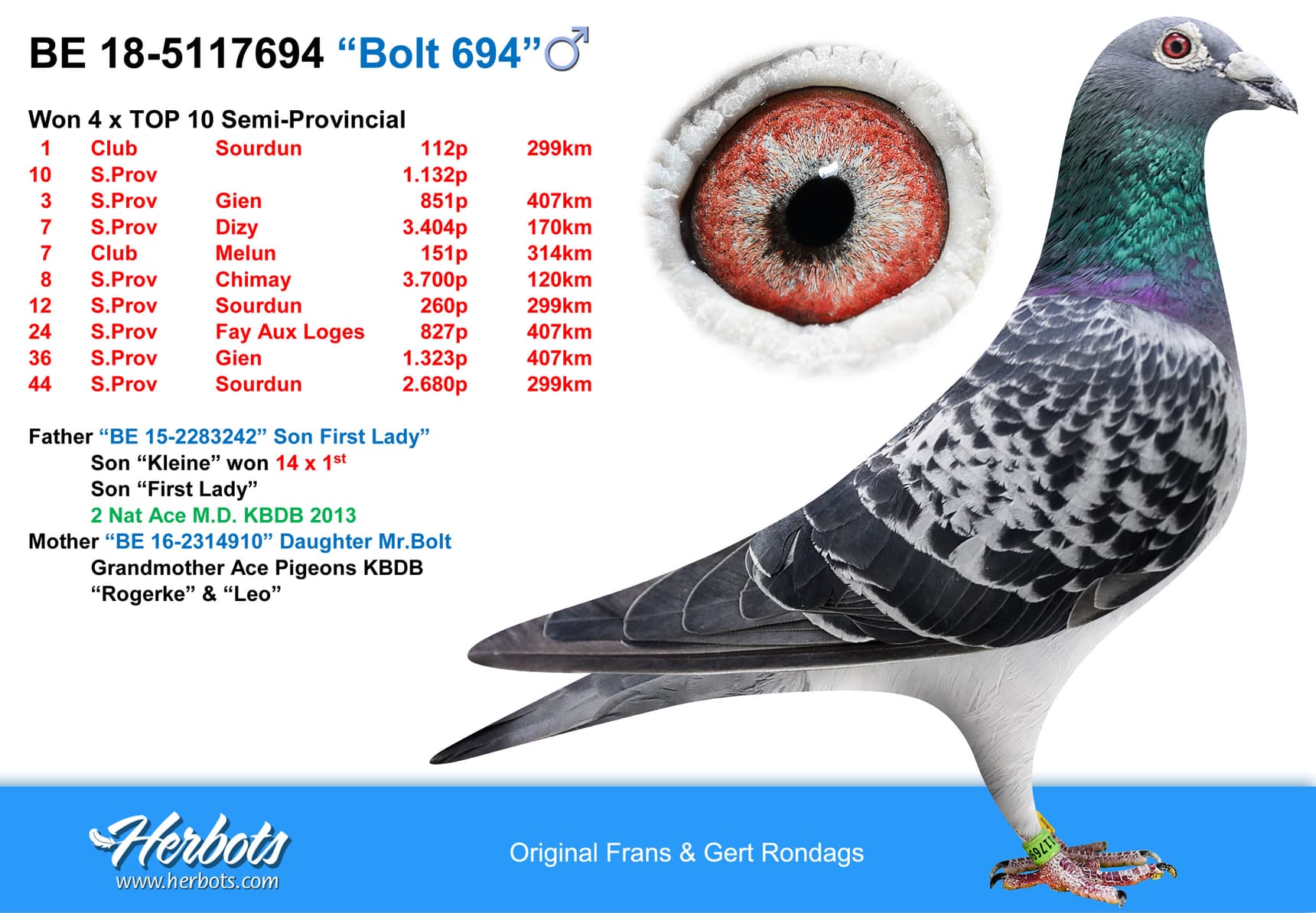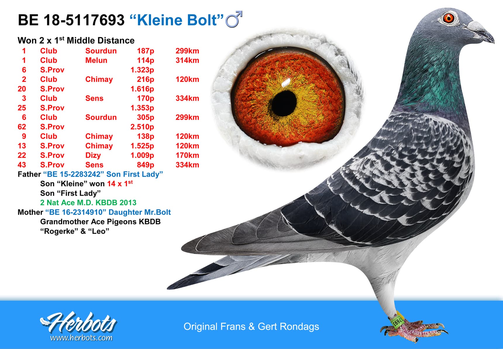 So he comes out of “Bolt 423” who was coupled then to sister “Martine”, “Martine” won 3rd Nat Ace bird Middle Distance KBDB 2014