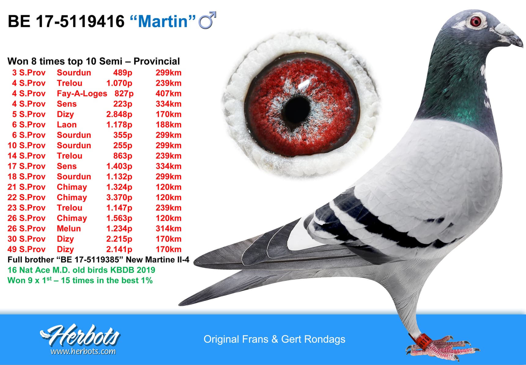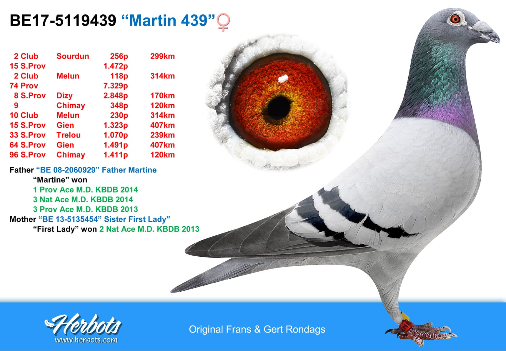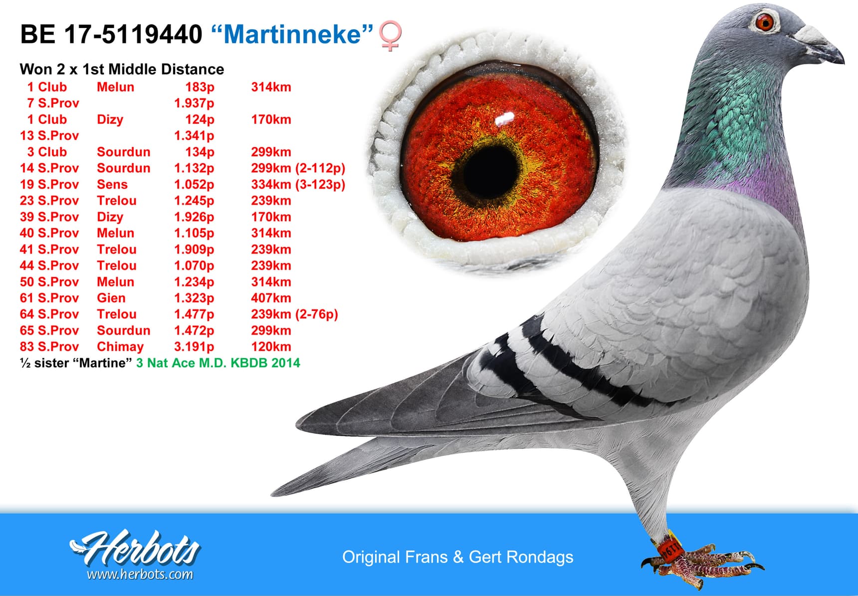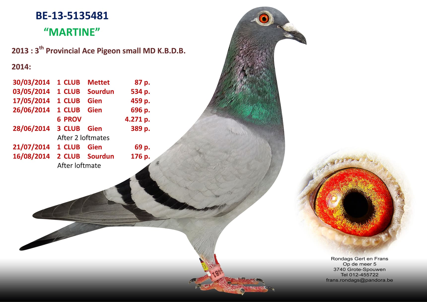 The last ace bird we will introduce is BE 13-5135481 “Martine”, she became 3rd National Ace bird Middle Distance KBDB 2014 and the year before already 3rd Provincial Ace bird Middle Distance KBDB 2013. She won ao: 1 Gien 696b – 1 Sourdun 534b – 1 Gien 459b -1 Orléans 211b – 1 Mettet 87b – 1 Gien 69b - …