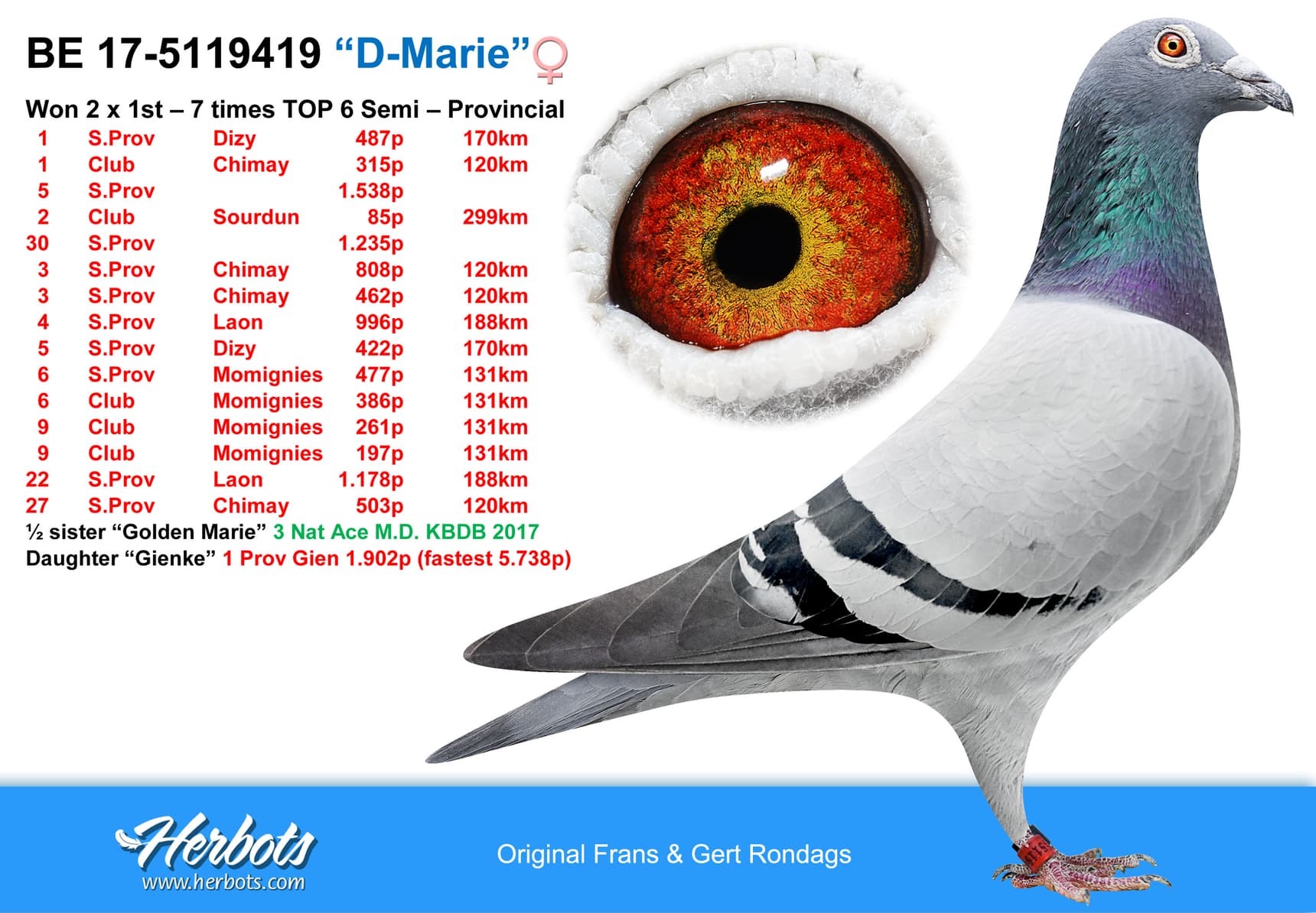 Her father is “Brothr First Lady” and her mother is “Martine”. Is herself 3rd National Ace bird Middle distance KBDB 2014 and became the year before 3rd Provincial Ace bird Middle distance KBDB 2013