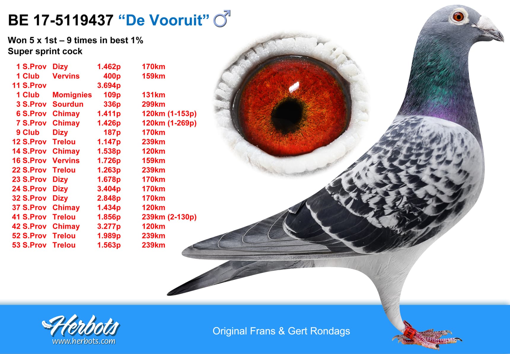 Also he was a super racer with 8 x TOP 10 Semi – Provincial and a golden breeding eye and a rating of 97.5 is this a golden investment for your breeding loft.