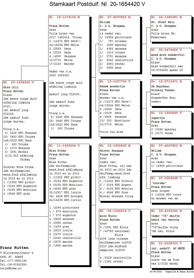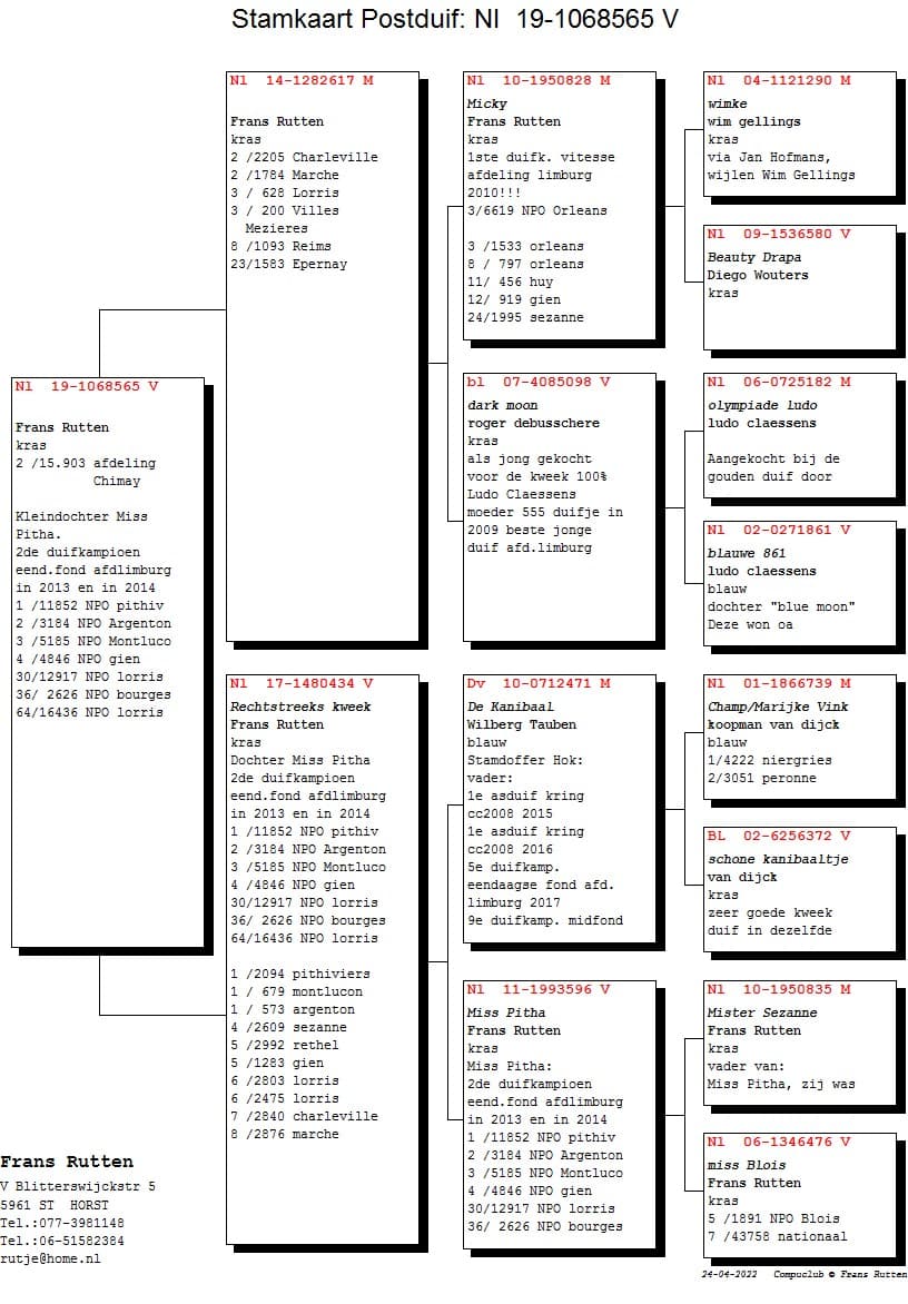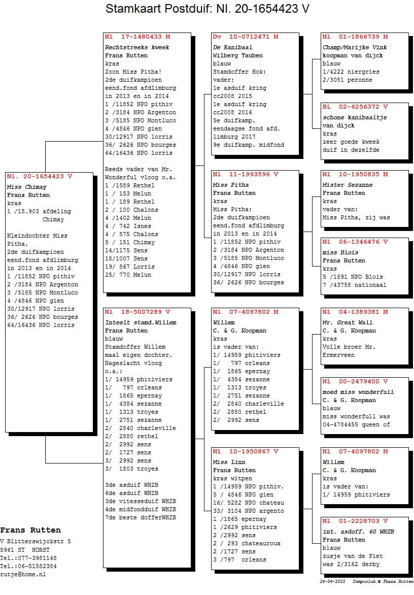 This hen was a super racing hen in her career, she won a.o. 1st NPO Pithiviers 11,852b, 2nd NPO Argenton 3,184b, 3rd NPO Montlucon 5,185b, 4th NPO Gien 4,846b, 30 NPO Lorris 12.917b, 36 NPO Bourges 2,626b, 64 NPO Lorris 16.436b and is a granddaughter of the one and only stock father "Willem"