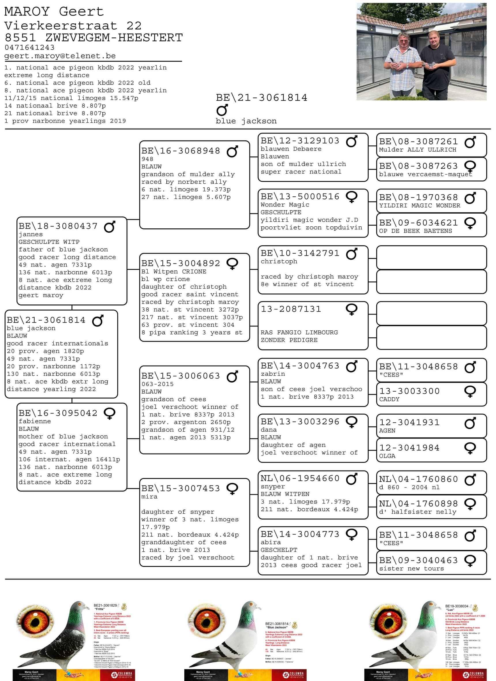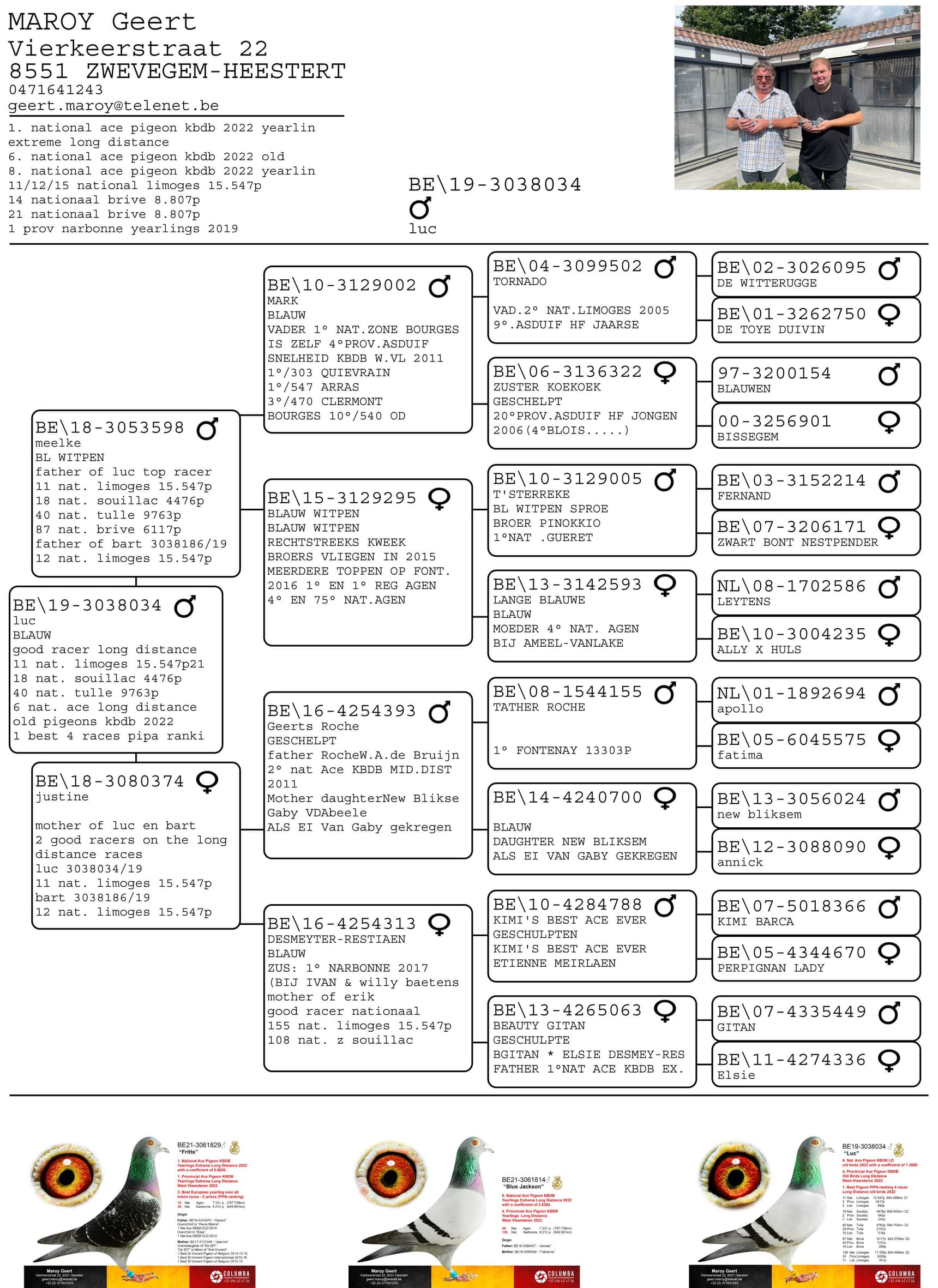 They are no boasters in Heestert, they prefer to keep it simple and to stick to the popular aspects of pigeon racing, but a humble pride may certainly prevail after such a season. It will stir up some emotions when the top step of the national podium is crowned with the title of ace pigeon of Belgium, but also with 3 pigeons within the top 10 of ace pigeons in long-distance and very long-distance.