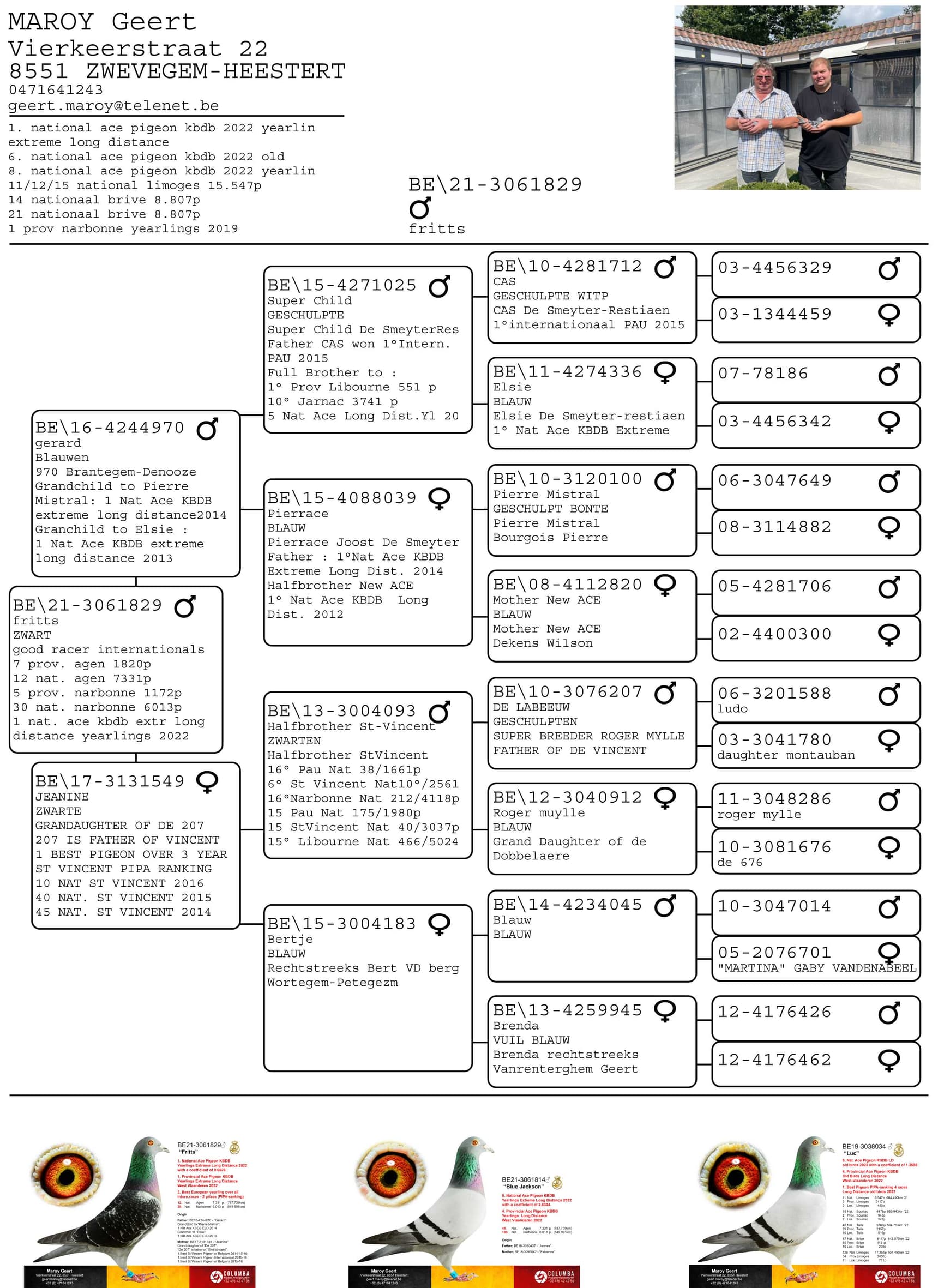When we ask which pigeons make up their breeding loft, we hear a few names such as De Smeyter-Restiaen, Brantegem-Denooze, Roger Mylle, Ameel-Van Laecke, Eric Debaere (and this includes quite a few pigeons from Norbert and Stefan Ally). In addition, some individual pigeons at risk of forgetting names
