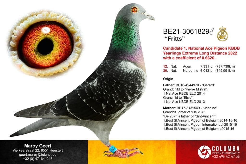 It's a very nice...yes, both the title and the pigeon. Fritts. It is a beautiful cock, very strongly made, a beauty in the hand and also talented with the power of youth. This cock proved that at both Agen and Narbonne.