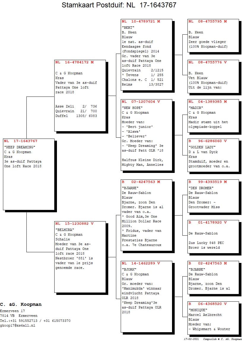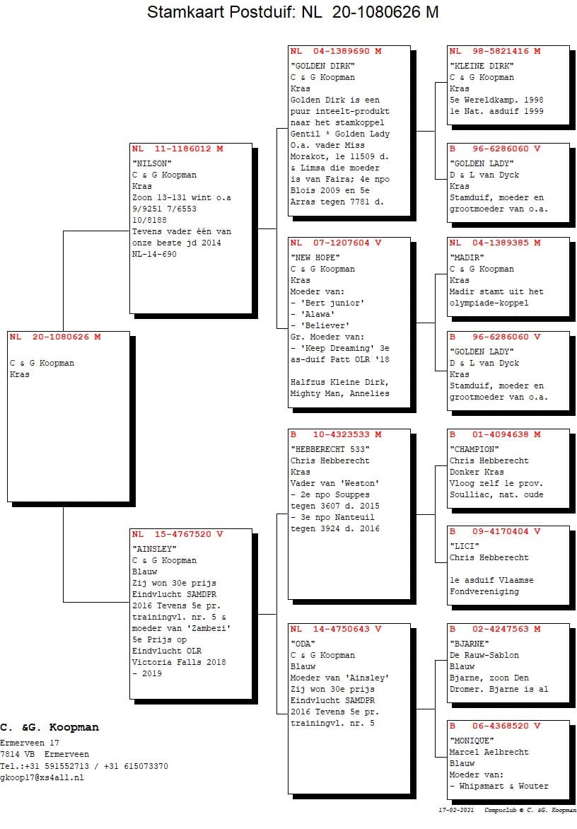 The achievements of the famous Dutch top colony Gerard Koopman are more than known by anyone who follows the pigeon sport. Achieving victories and preferably against thousands of competitors is simply baked in the blood of the Gerard Koopman pigeon. We can list a lot of internationally known Koopman pigeons but the absolute leader, first on the racing loft and afterwards on the breeding loft, was without any doubt "Kleine Dirk".