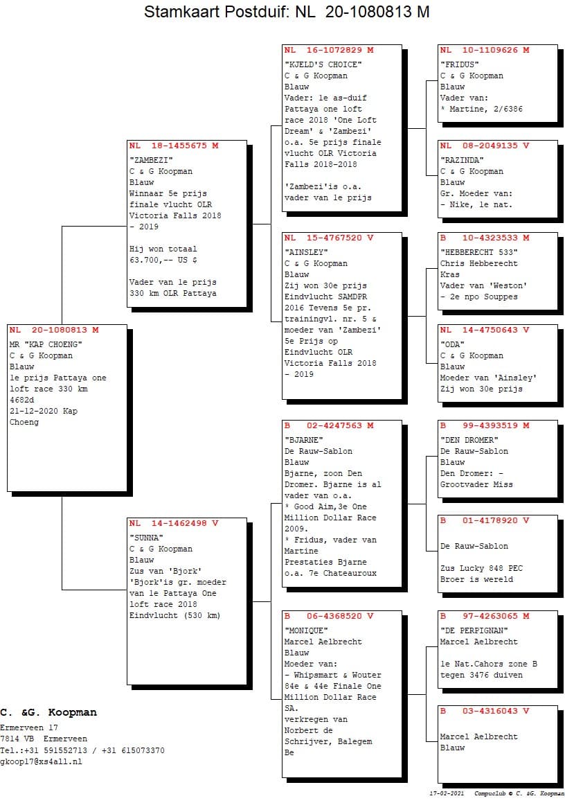 ‘Zambezi’ is father to Mr. ‘Kap Choeng’ 1st prize winner Pattaya OLR from 330 km race at 21 december 2020