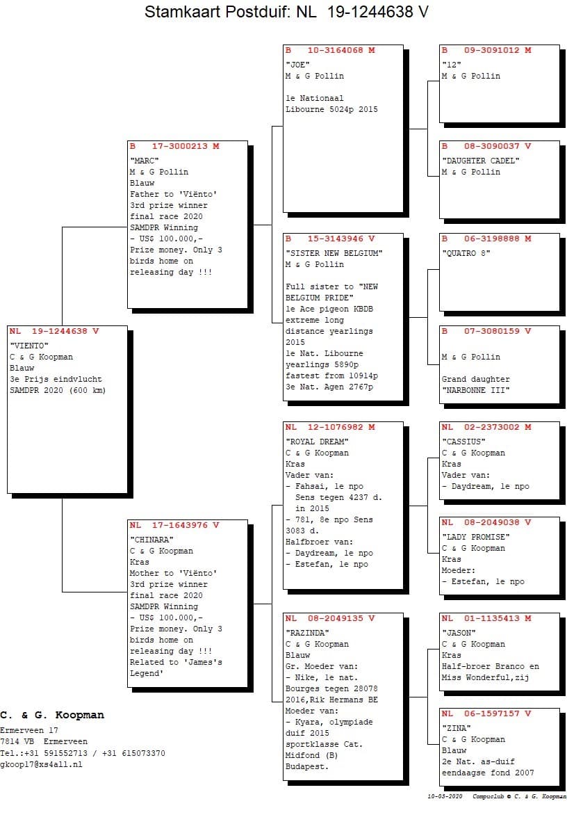 ‘Viento’ NL-2019-1244638 wins 3rd prize in final race (only 3 birds home on releasing day) Prizemoney: US $ 100.000,--  Sold for: US $ 28.000,-- Pooling money: US $ 6600,--  Totally: 134.600,-- US $