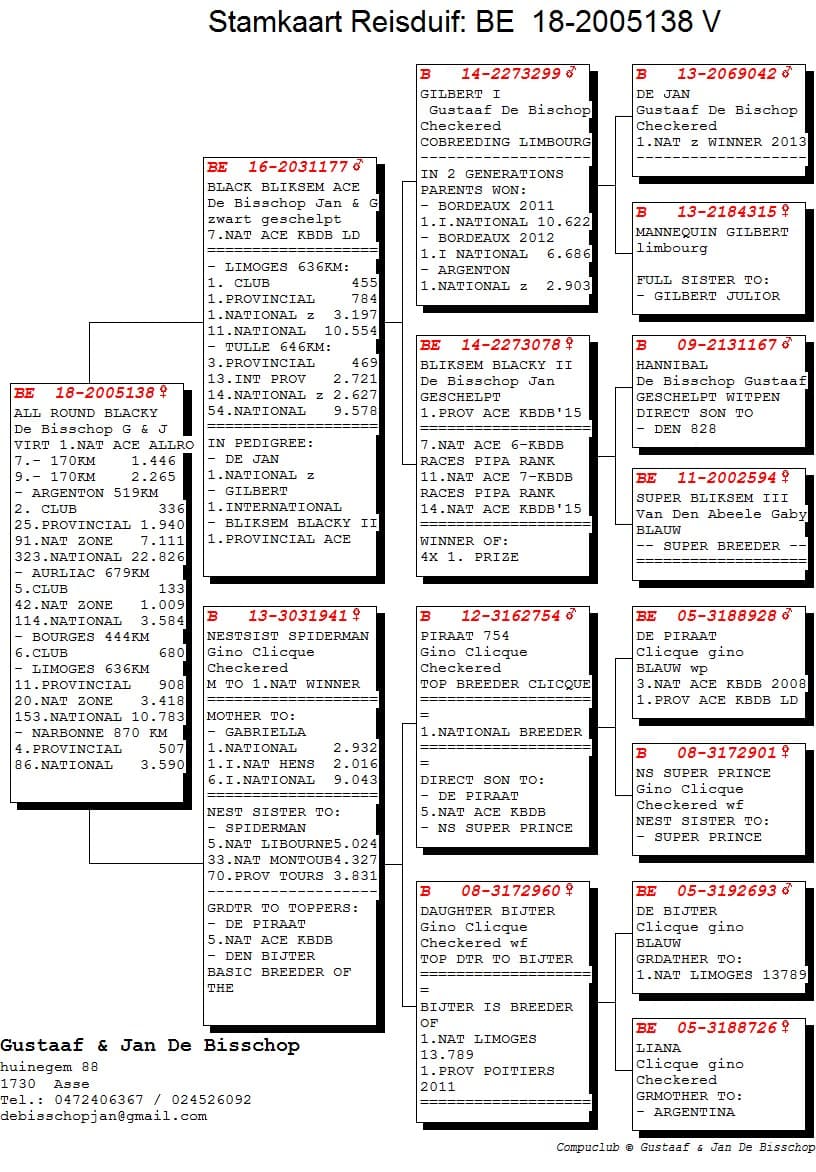 The success story begins again with the golden breeding couple “Hannibal” x “Super Bliksem III”. They became parents to Bliksem Blacky I, II, III and IV. Next to this these hens are doing extremely well on the breeding loft as “Bliksem Blacky II” became mother to ‘Black Bliksem Ace”. This cock became 7th National Ace bird KBDB year birds 2017 and is now father of the 1st National Ace bird KBDB All round 2019. The proof that this golden breeding couple is a real unique couple where more generations give super pigeons.