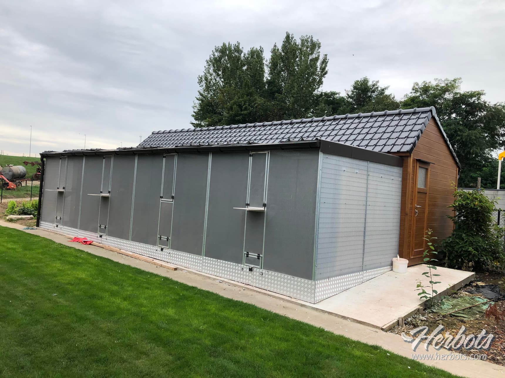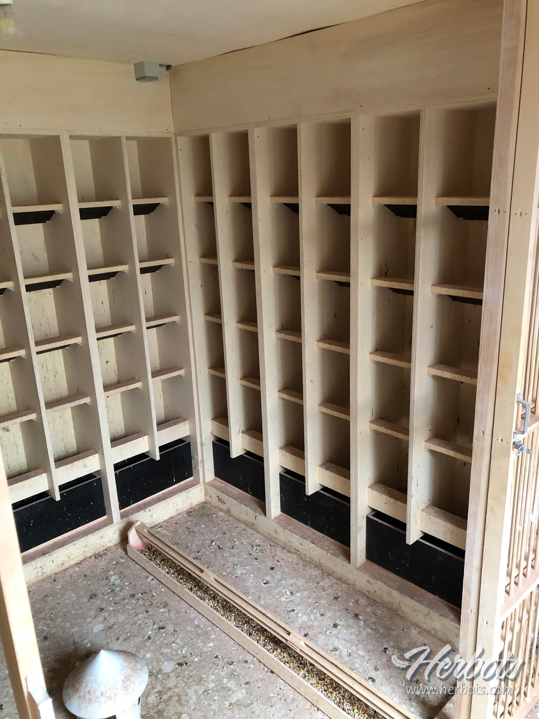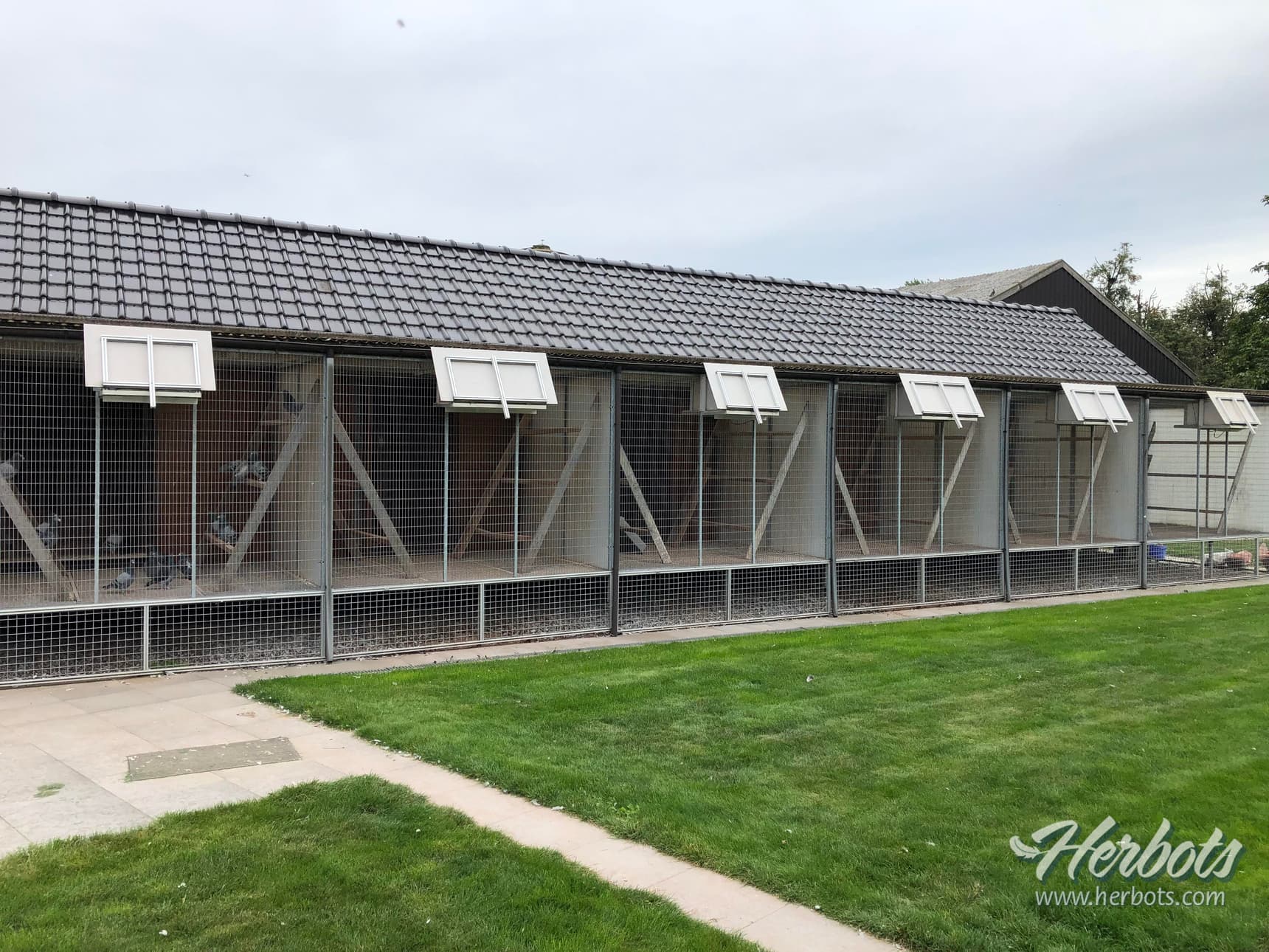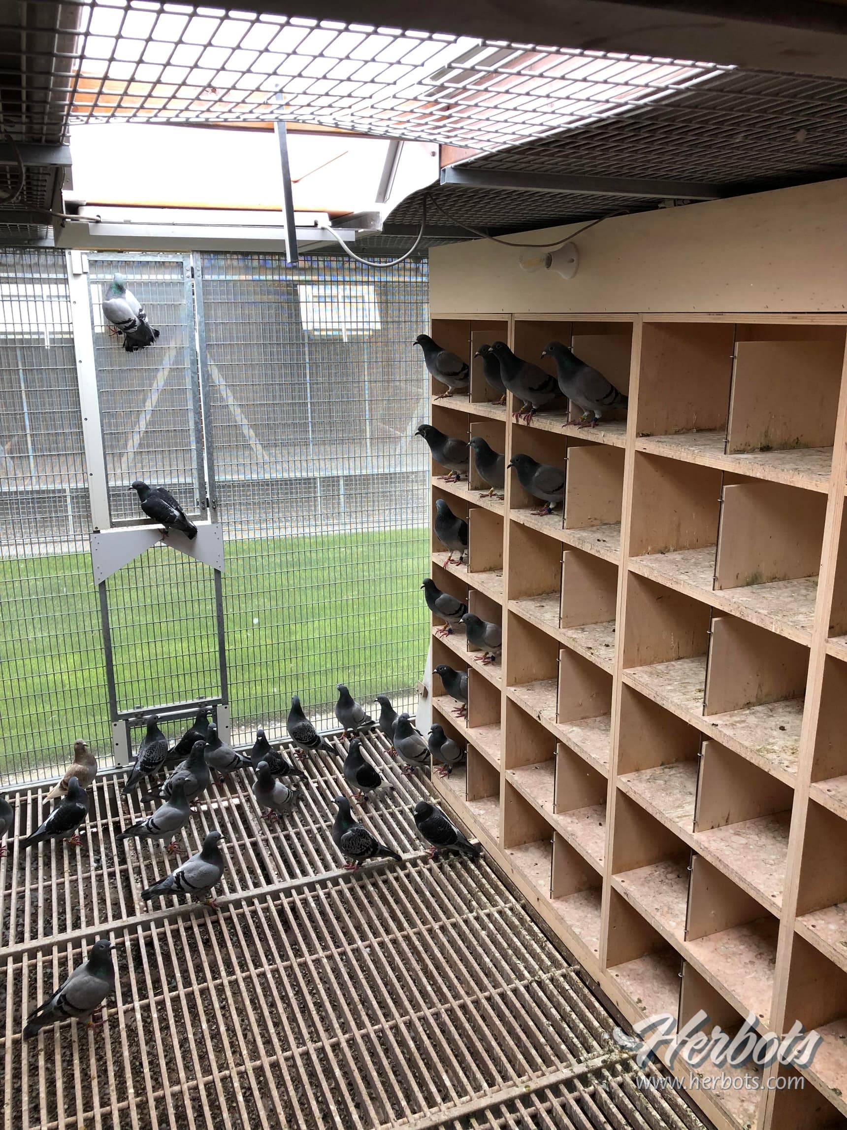 They’ve built a new loft past Winter for the youngsters, about 300 youngsters where being placed on this new loft. It is a deep loft with a hallway in front and in front of that again big aviaries who are fully closed. The front is being protected with wind breakers and the pigeons can go into the loft via the roof of the aviaries. The roof itself is fully isolated and during the day they can choose by going in to the loft or staying in the aviaries, the bigger part of the day they like to stay in the aviaries. The entire racing team has been darkened from the beginning of April until the 21st of June as from 18h in the evening until 8 o’clock in the morning. From the longest day on they are being enlightend until the end of the season from 05h30 in the morning until 23h in the evening.