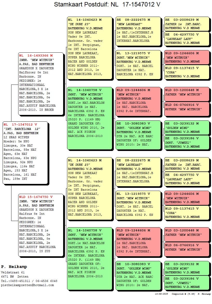 We also have children of ‘TED’ (1st NAT Agen JL, Winkens-Rothenburg), “Beau” (1st NAT Agen, Gielen), ‘Kleine Meike’ (Jellema), ‘Bergerac Max’ (1st NAT Bergerac and ace pigeon division, Gert Krab), ‘King Narbonne’ (1st INT Narbonne, Vreugd-van Beek). “Barbara” (Verweij-de Haan), ‘Lilly’ (Verweij-de Haan), Dark Dax (Verweij de Haan). Grandson of the ‘Malika’ (Kroon-Erren (father 1st NPO Ruffec). A number of these pigeons are still very young and will have to prove themselves.
