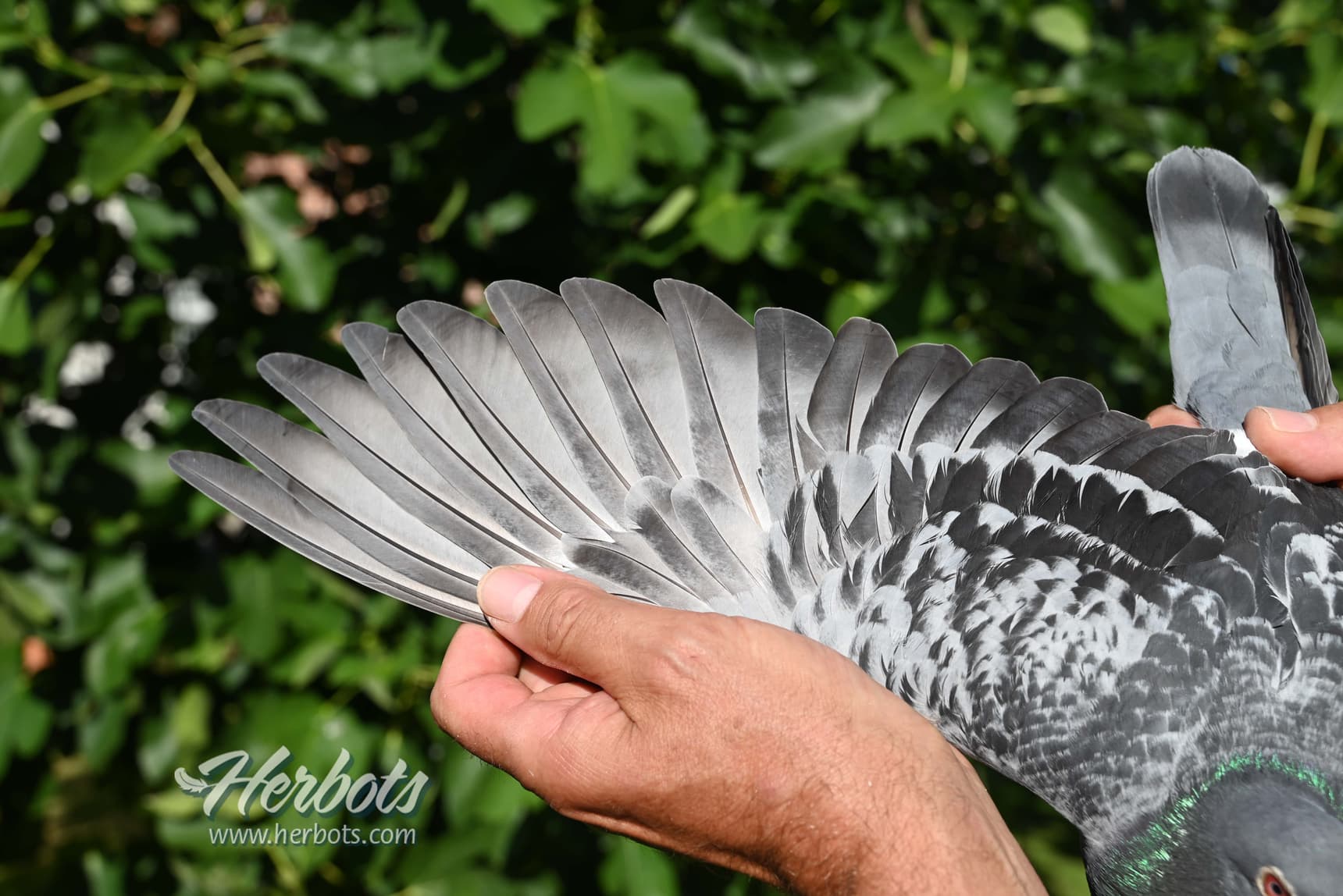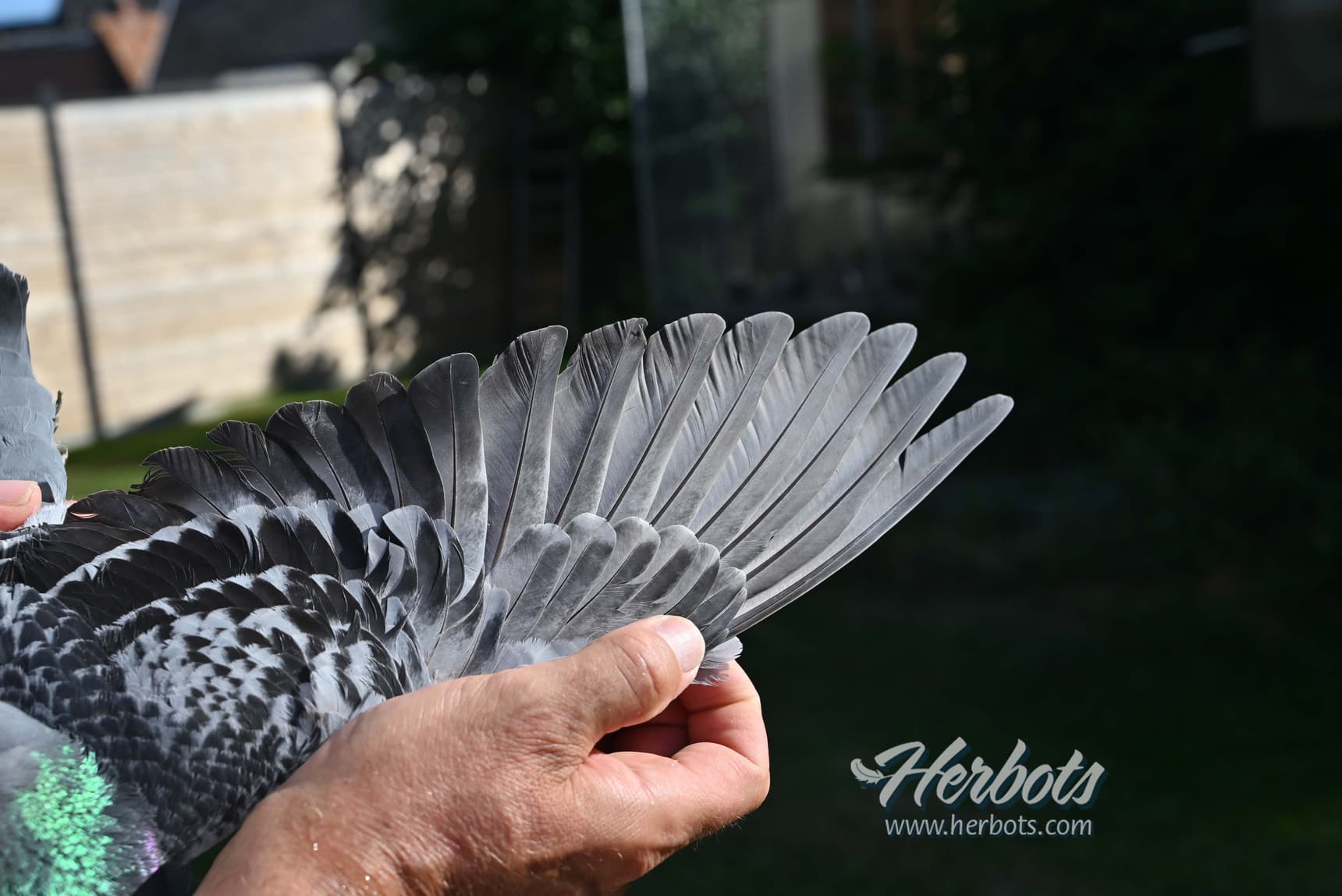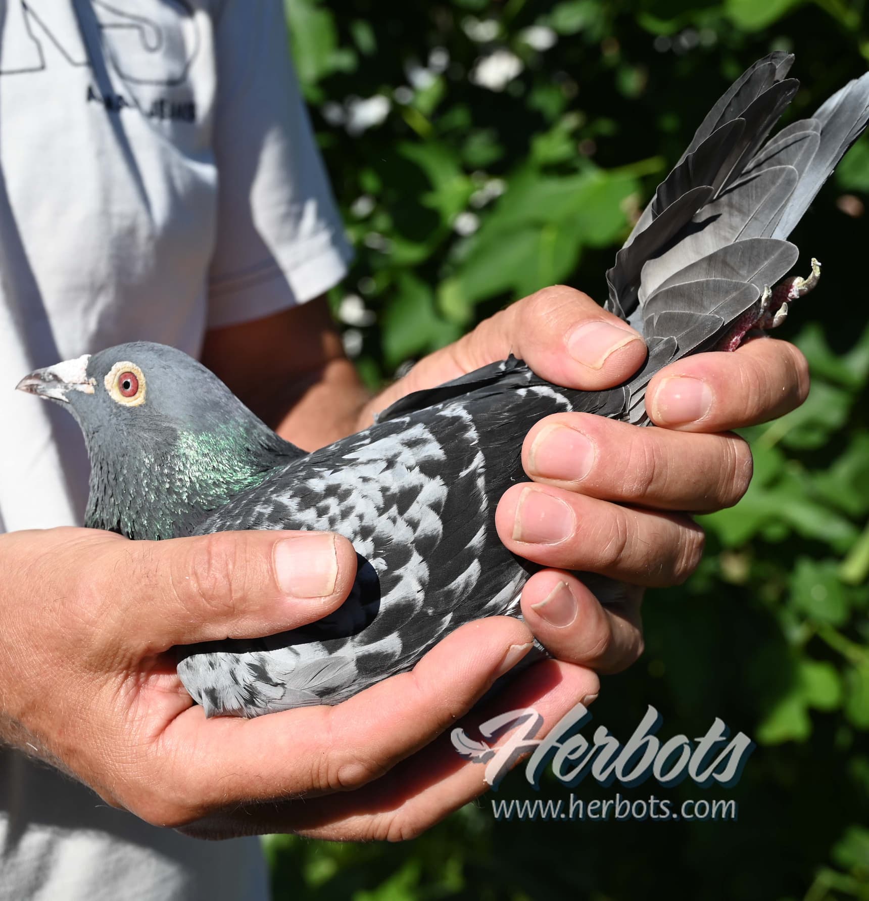 National winner was scalloped cock "B20-6055712". "712" is of the smaller type and particularly striking was his look. His characterful eye shines like no other and speaking of character, when owner Wim took his hen away the "712" blew himself up with colère. Rarely seen a cock so angry because his hen was removed. But that was not all. It was striking that he was alone in a loft. Wim explains "indeed, he bred in the loft next door and in fact he is on the loft of my other 17 widowers but he could not settle down there and always wants to stay here on this loft. So I have allowed that and apparently this motivates him tremendously because otherwise he would not have these achievements on record. "