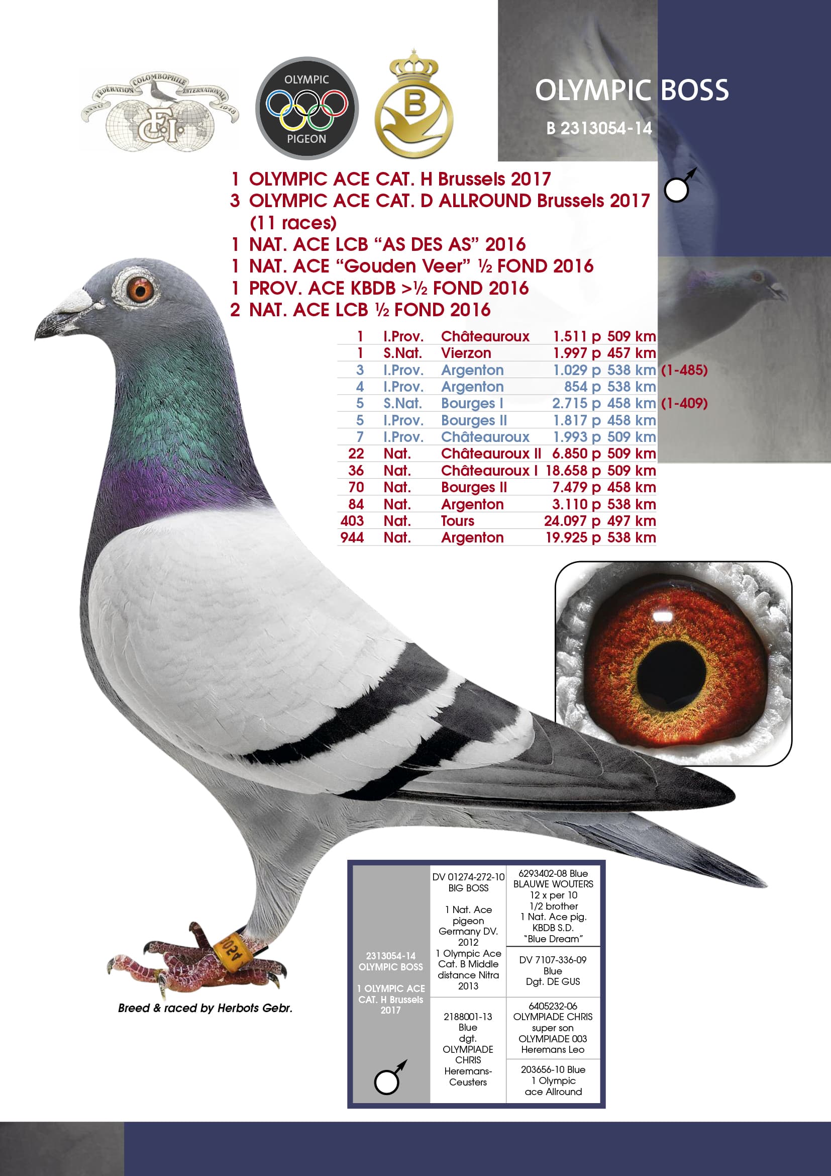 Well … take our Brussels Olympic bird in the all-round category ‘Olympic Boss’ (B14-2313054) for example. As a young bird, he performed well, but not remarkably. He was particularly talked about when he stayed behind in the very bad Gueret in 2014. The pigeons were only released at 10.30 AM and with severe head wind and dark weather to make things worse. None of the clubs was able to close the race the same day … that says enough! “Olympic Boss” was called in a few days later only at 3 km from his own loft. He was caught by a pig farmer … completely exhausted and skinny as hell. Nevertheless we gave him another chance and he recovered extremely fast, which is always a good sign. ‘Olympic Boss’ pulled through the moulting period perfectly and got his second chance as a yearling. He did not disappoint and two years later we can add the Olympic nomination to his impressive list of victories.