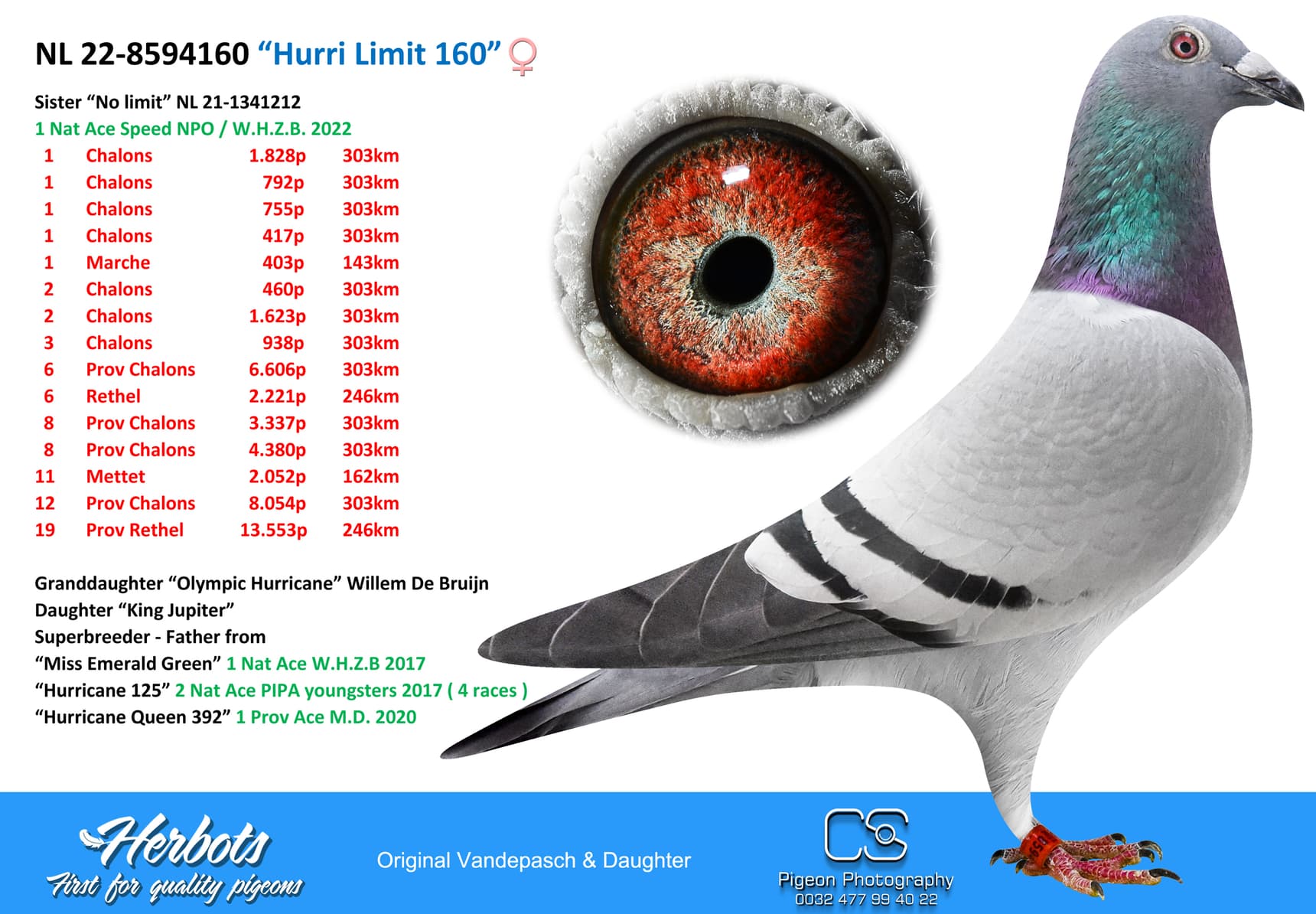 The ace pigeon “NL 21-1342212” No Limit is a daughter of 2 children who come further from their 2 best breeding lines of their colony. This is the super breeder "Jupiter" coupled to "Mother Olympic Ranomi" who were then crossed with the "Olympic Hurricane" line of Willem De Bruijn.