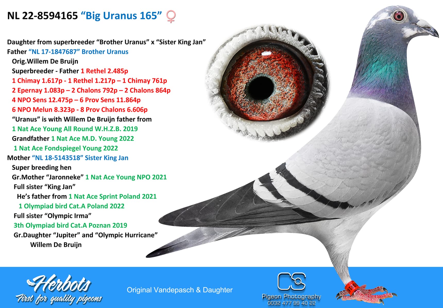 A daughter of "Broer Uranus" who has become a real super breeder in a short time and is here coupled to "Zus King Jan". This hen is grandmother of 1st National Ace Pigeon NPO youngsters 2021. She is also a granddaughter of "Jupiter" and "Olympic Hurricane"
