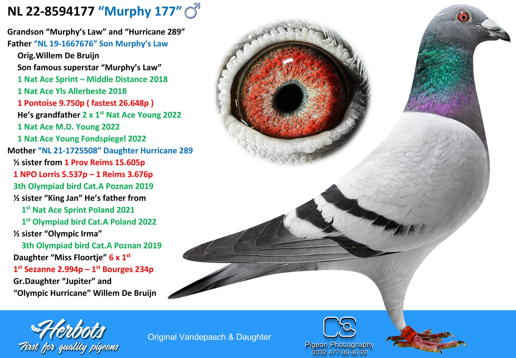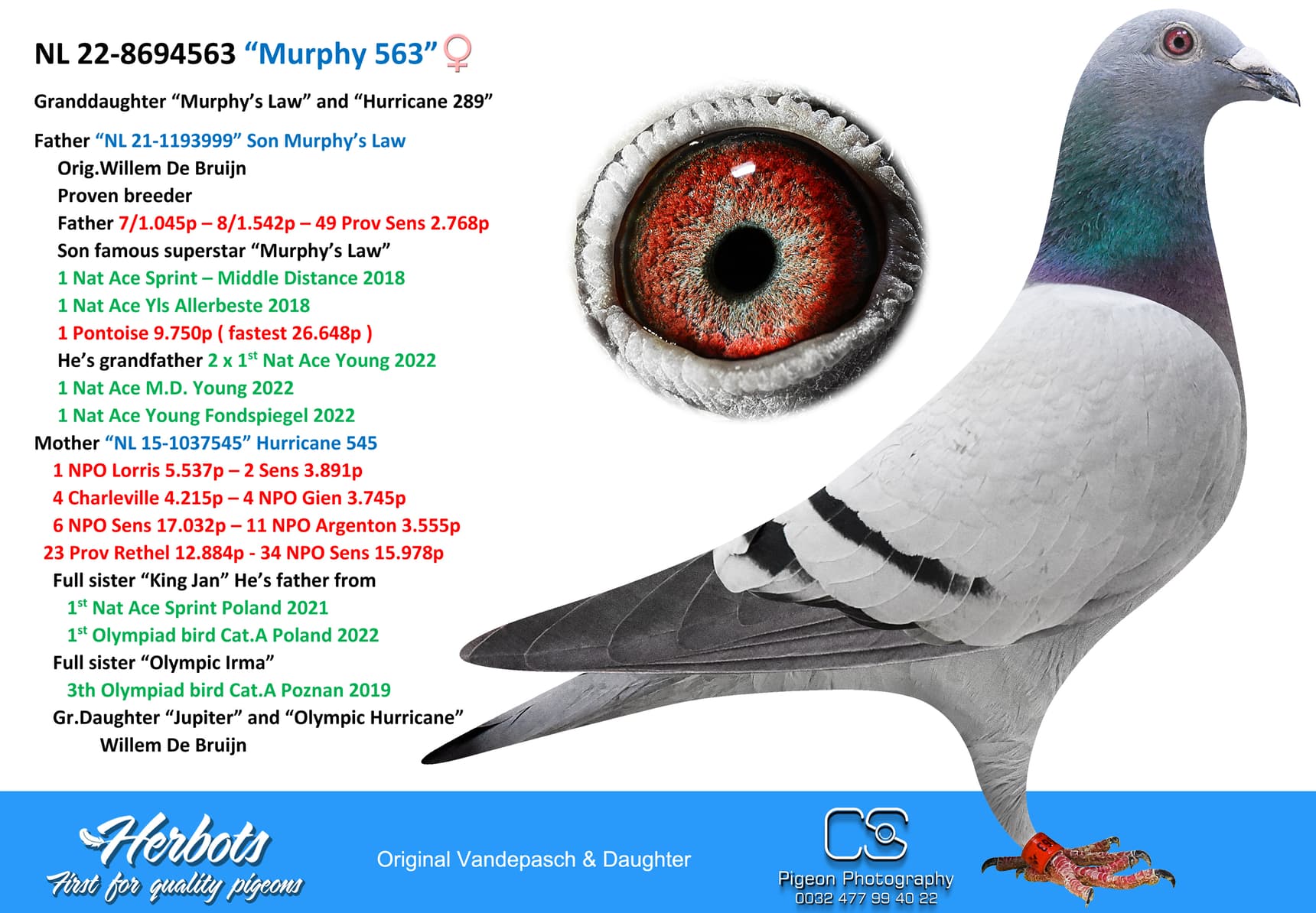 Has been bred from a son of "Murphy's Law" coupled to super hen "Hurricane 545" who herself won 1st NPO Lorris against 5,537 pigeons and raced 4 x TOP 12 NPO in her career. She is a granddaughter of "Jupiter" and "Olympic Hurricane"