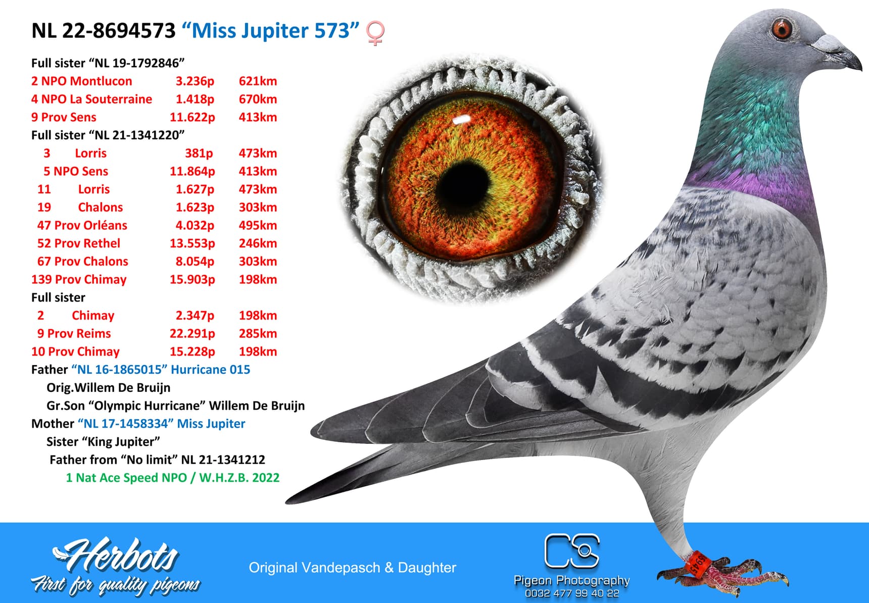 “Jupiter” itself is a crossing of Willem De Bruijn x Dochter Lowieke as we mentioned above.In the new top pigeons of the 2022 season, "NO LIMIT" is again a granddaughter of this classy pigeon "Jupiter". “Jupiter” x Willem De Bruijn simply hits the bull's eye.