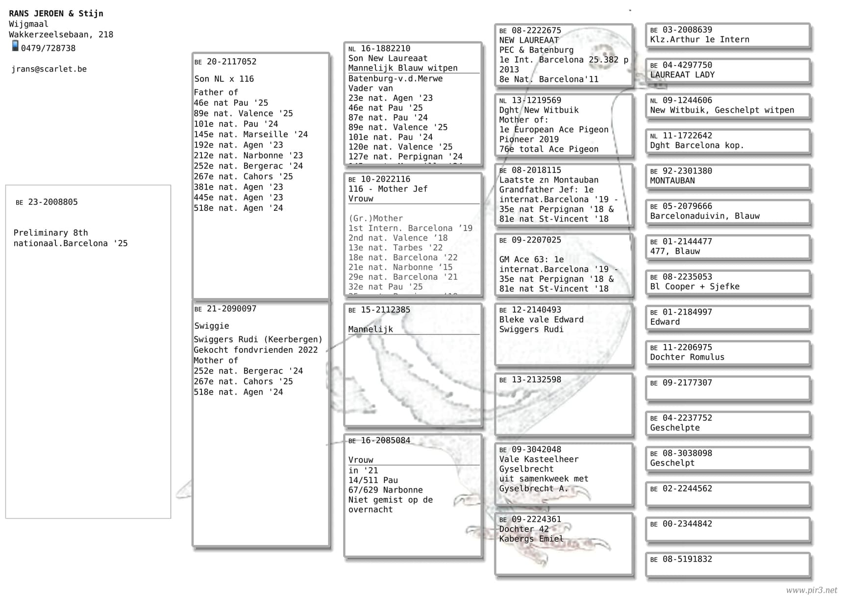 The provincial winner is no fluke, quite the contrary. BE23-2008805 is a grandson of the proven breeding cock NL16-1882210, a direct son of "New Laureaat", the legendary winner of the 1st Barcelona International 2013 against 25,382 pigeons. The influence of this line can still be felt, as the sire of 805 produced 46th nat. Pau '25, 89th nat. Valence '25, and also sired several other top national pigeons. The granddam of BE23-2008805 is "116", the dam of "Jef" (1st I.Nat. Barcelona '19 of Stijn and Jeroen), who herself has produced several national top flyers, such as 1st I.Nat. Barcelona '19, 2nd Nat. Valence '18, the 13th Nat. Tarbes, and so on.
