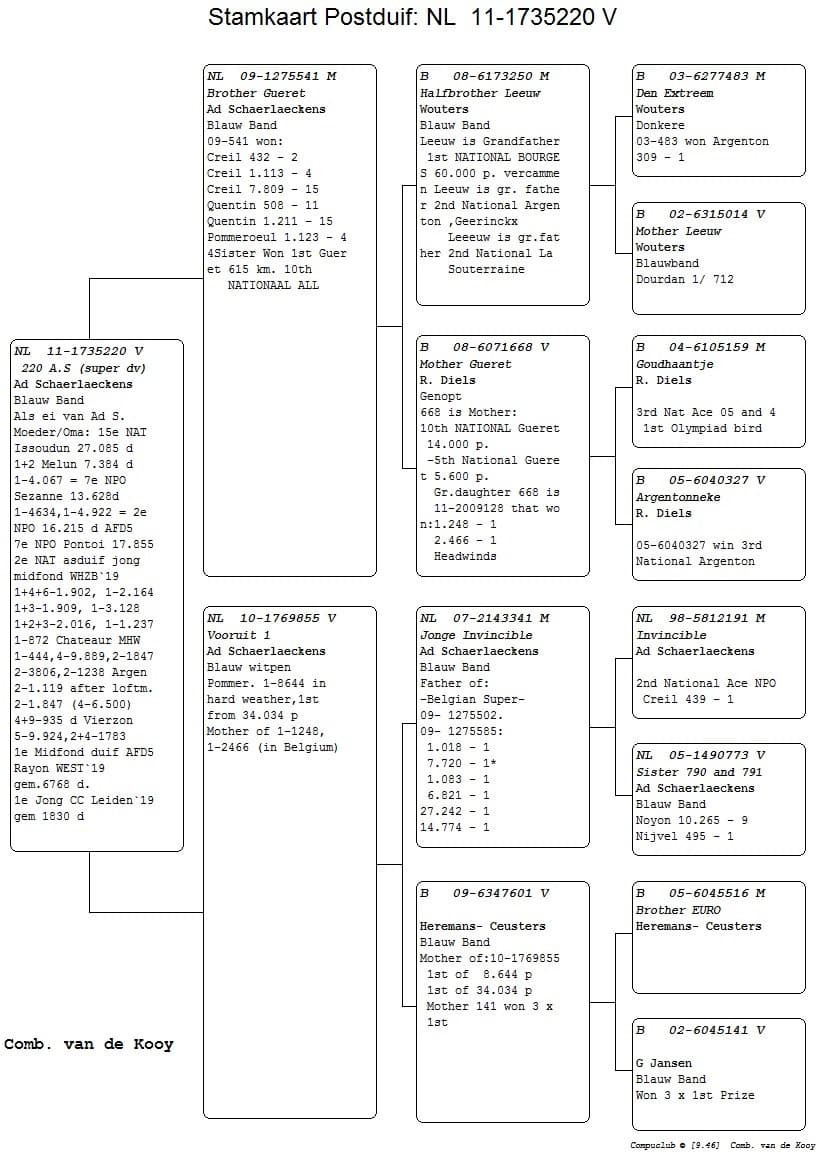 In 2011, Jeroen was fortunate to obtain six eggs from legendary pigeon fancier Ad Schaerlaeckens. This turned out to be a golden move. Especially the hen NL11-1735220 proved to be a real topper.