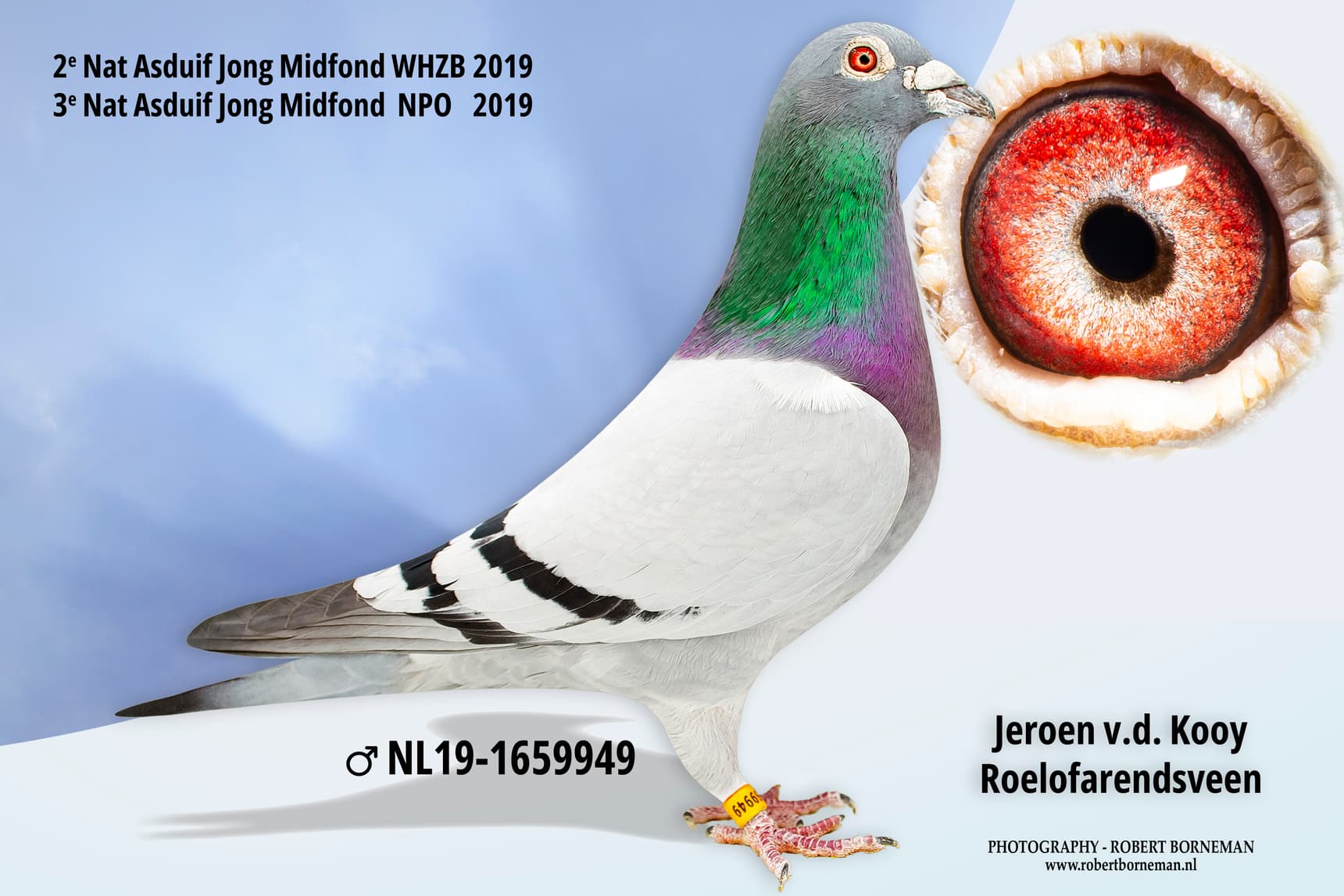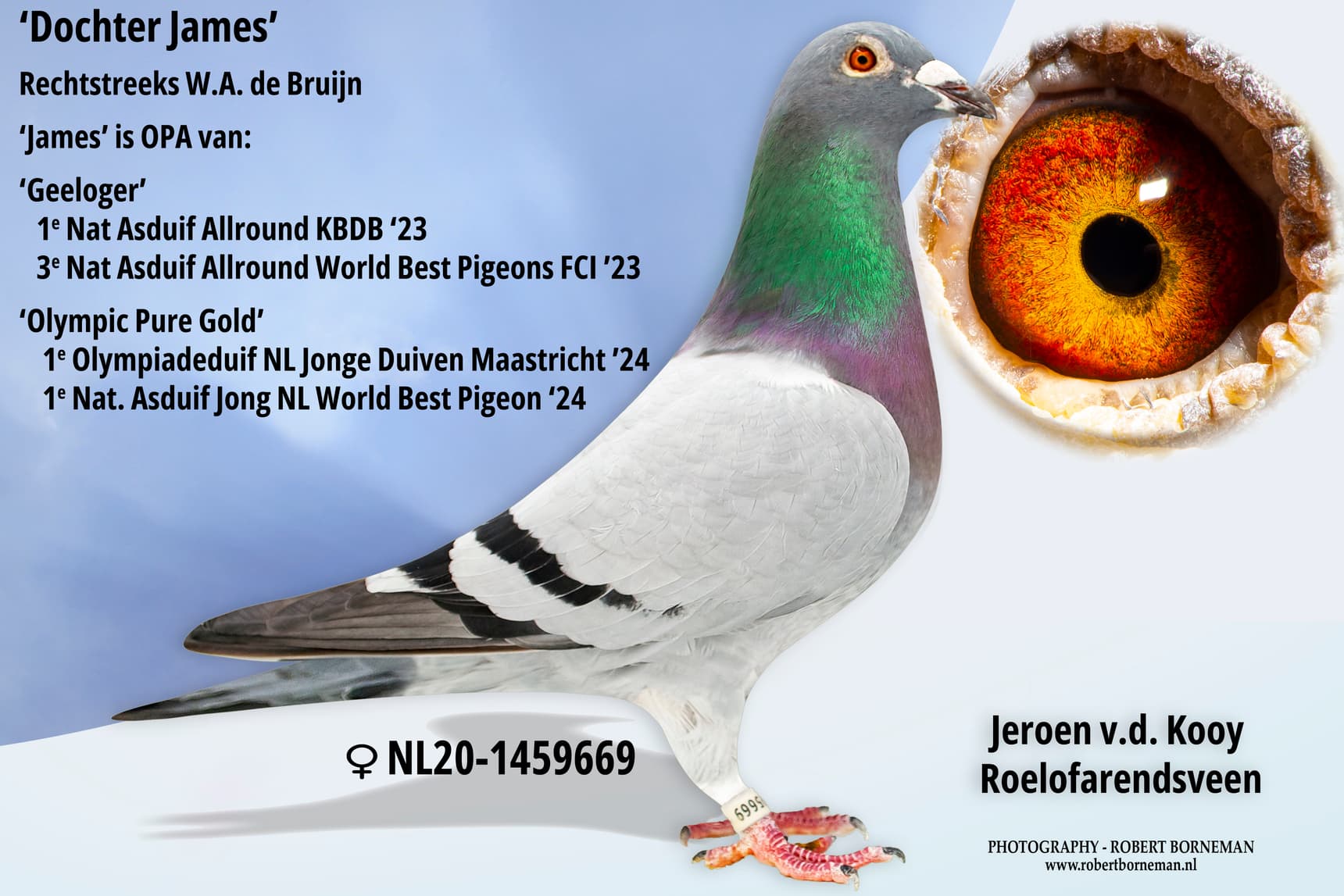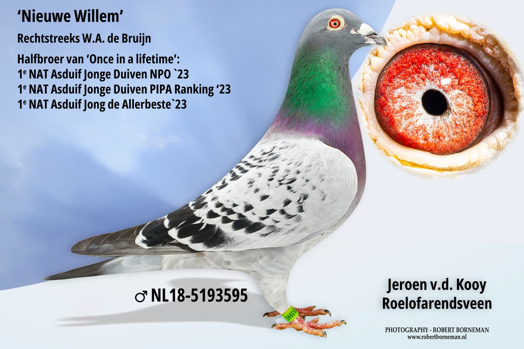 Her offspring is still flying on the lofts of Jeroen, who further enriched his breeding with pigeons from other top fanciers such as Willem de Bruijn, Ton Wolvers, and Henk & Lucie Scheffel. In the past, Jeroen also achieved great success with pigeons from Demely-Liliane, his uncle Wim, with a cock from Antoon van de Burg and Jeroen Kok. These additions have only strengthened the quality of his pigeon stock.