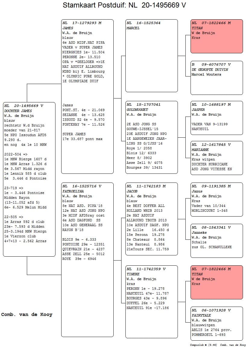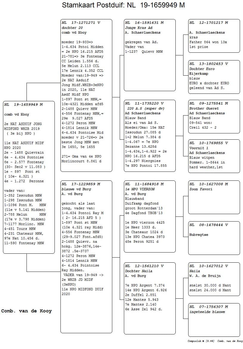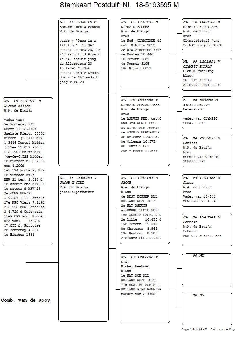 Her offspring is still flying on the lofts of Jeroen, who further enriched his breeding with pigeons from other top fanciers such as Willem de Bruijn, Ton Wolvers, and Henk & Lucie Scheffel. In the past, Jeroen also achieved great success with pigeons from Demely-Liliane, his uncle Wim, with a cock from Antoon van de Burg and Jeroen Kok. These additions have only strengthened the quality of his pigeon stock.