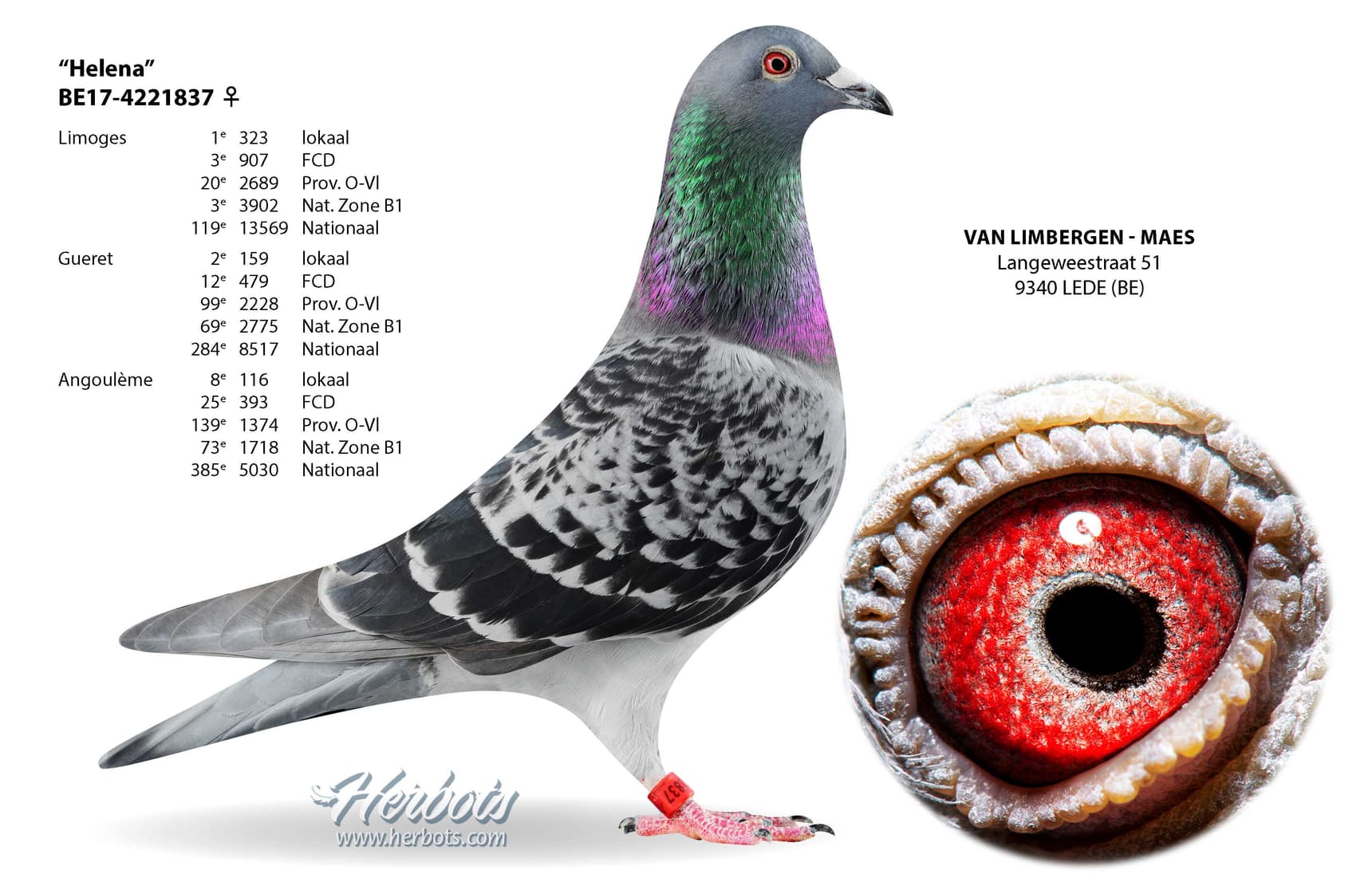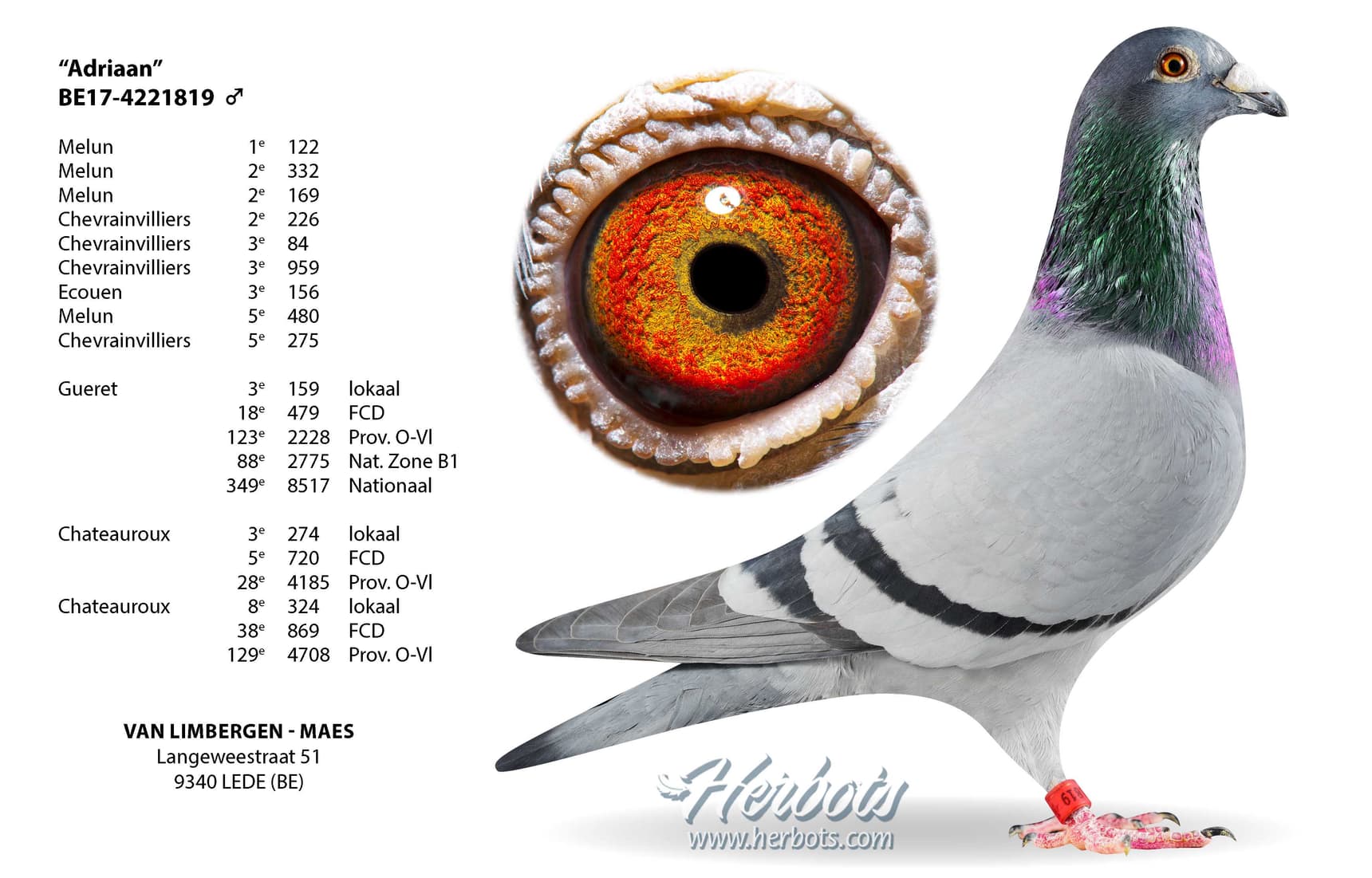Oude lijn uit 'De Goeien Bleken' 4513818/99 nog steeds . Met Gert De Swaef ( Hofstade) de grijze soort uit 'De Grijzen'.Gebroeders De Meerleer ( Hillegem) de grijze soort uit 'De Grijzen'. Willy De Cremer in Denderhoutem werden late jongen uit zijn 'Kolonel' en 'Koningin' (lijn 'Goldwing' Vandenabeele). Ook duiven van Gaby Vandenabeele (onder andere ook via Raets Gebroeders en Kenny, Vliermaal), maar ook Geerinckx, Rudi De Saer, De Rauw-Sablon, Houfflijn, Foxwood ,Johan Tant, twee duivers van Dirk Tibergyn (ras Emiel Denys) , Willy François uit Serskamp. Vorig jaar werden ook duiven gehaald bij Rudy Kerre uit Berlare.