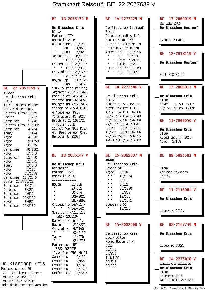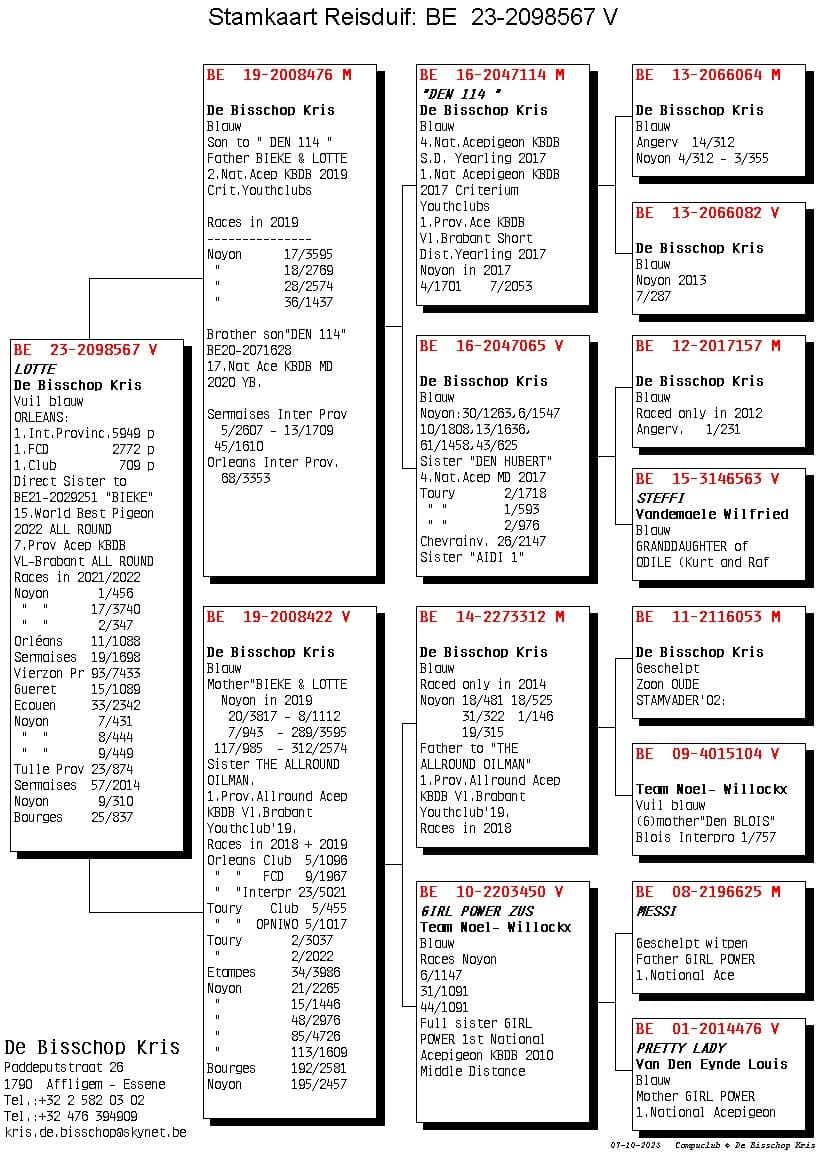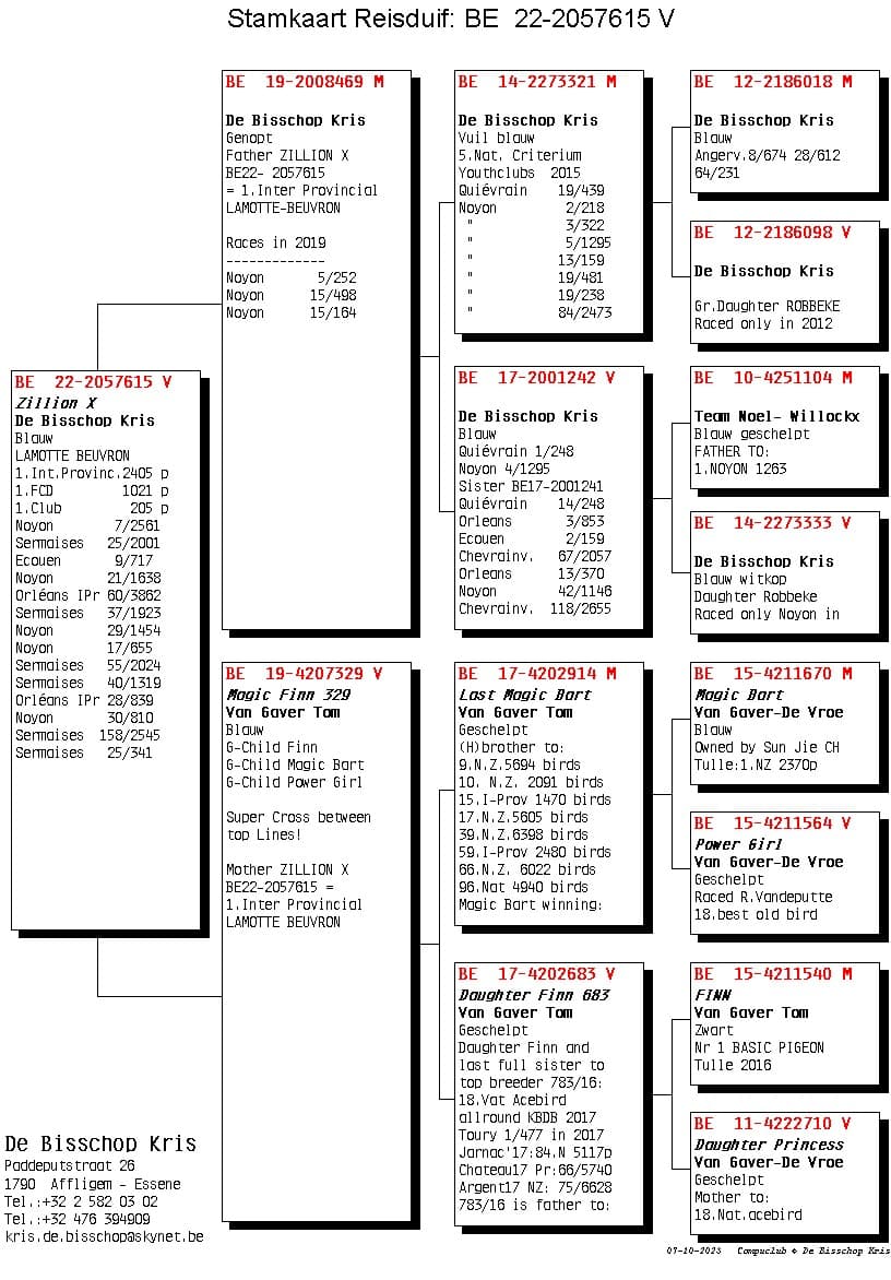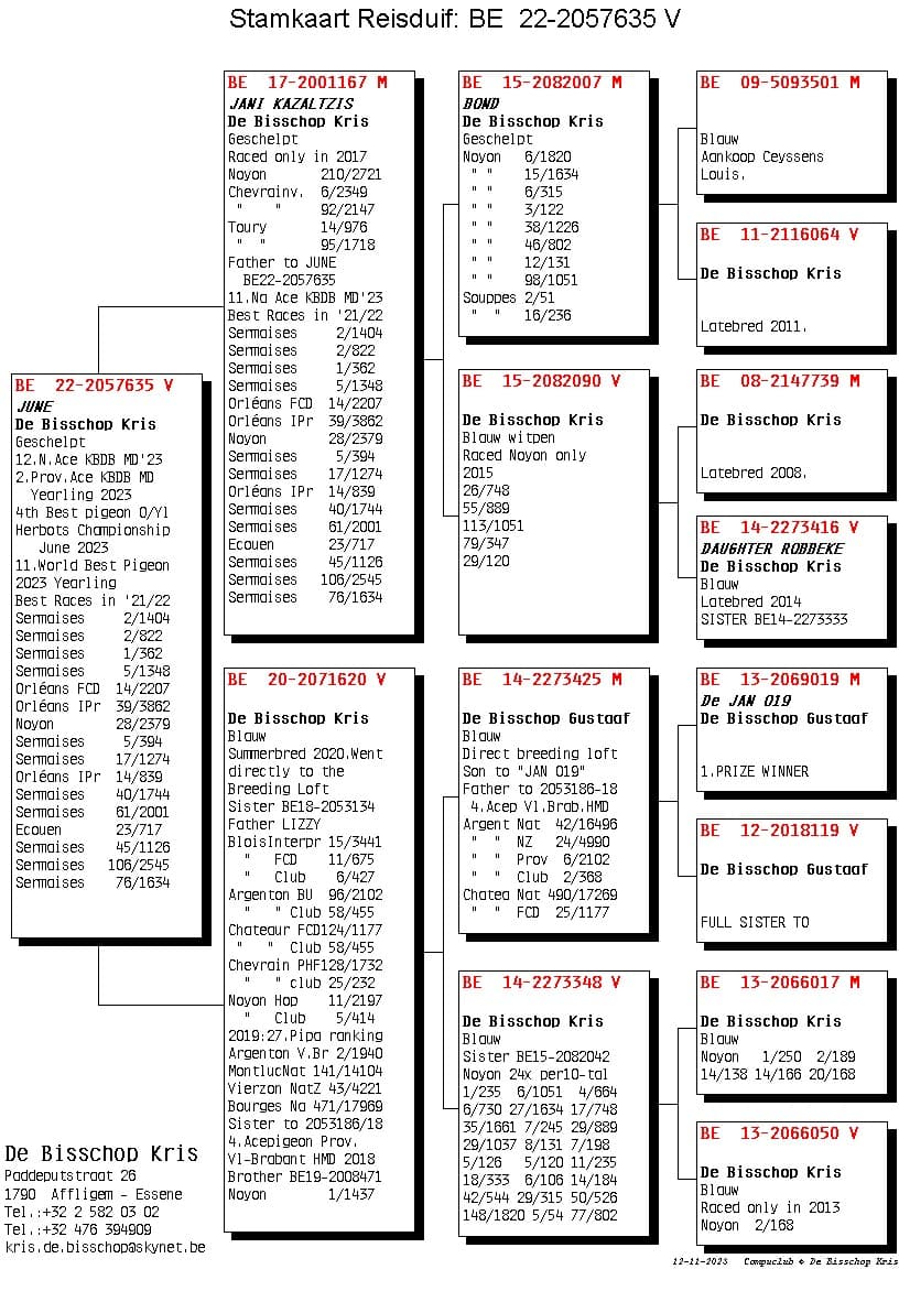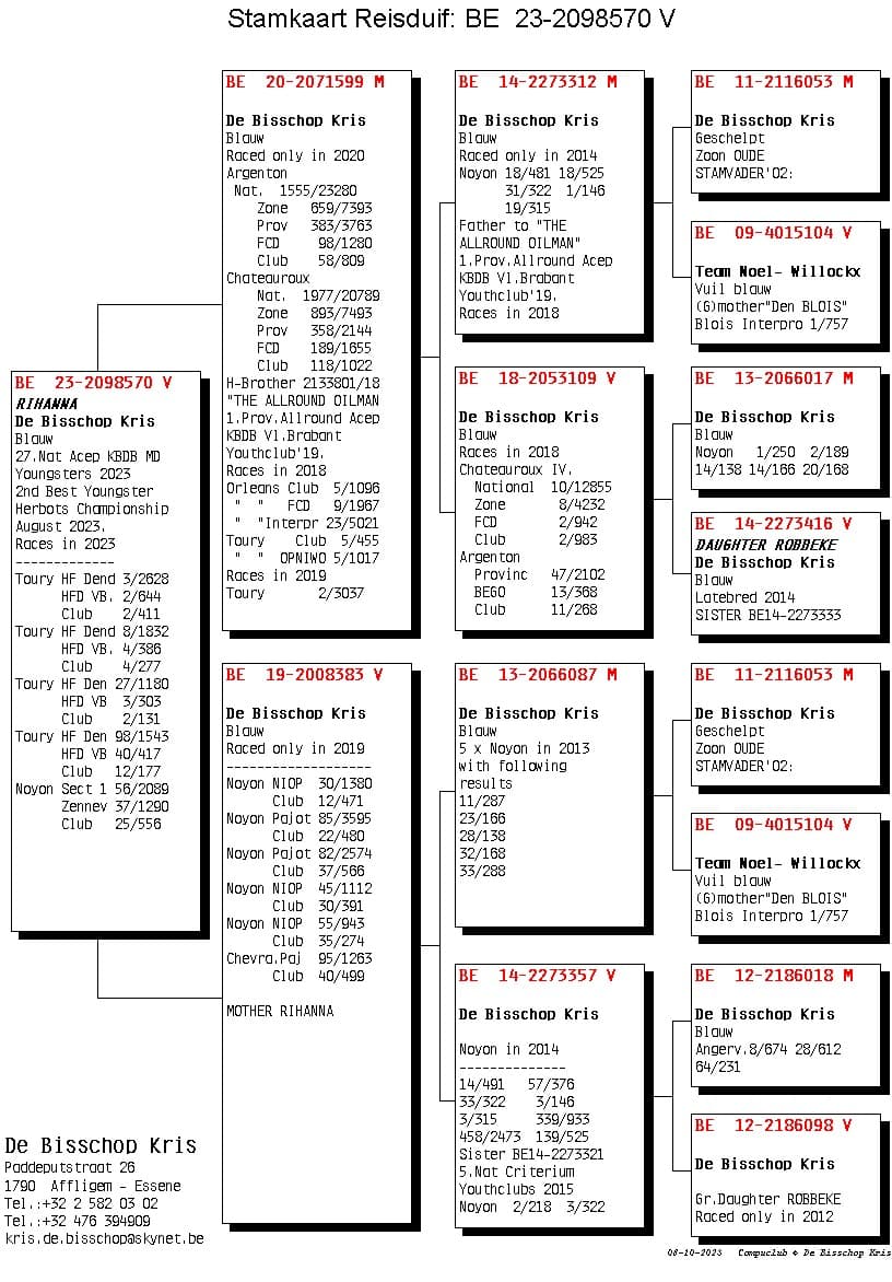 Son from “321/21” Blue 5 Nat Youth 2015 “242/17” Won 1 Quievrain 248p – 4 Noyon 1.295p and is granddaughter base breeder “Robbeke”