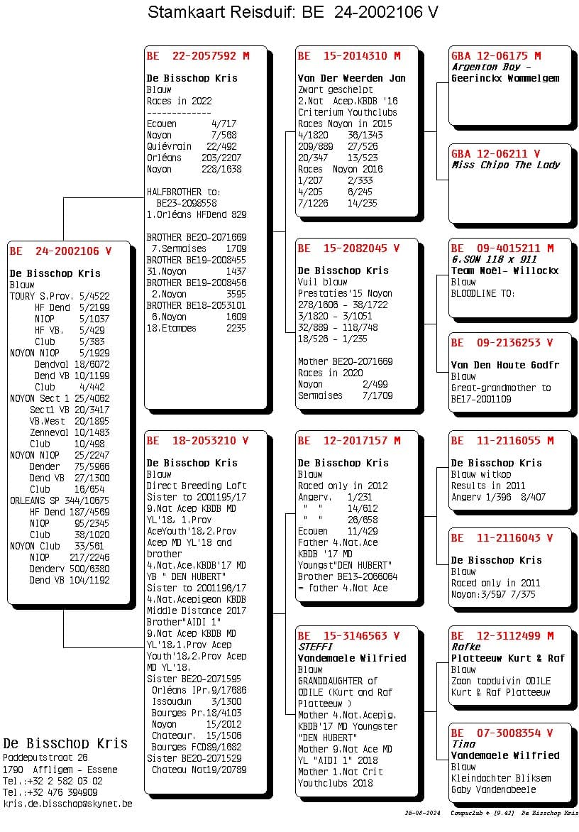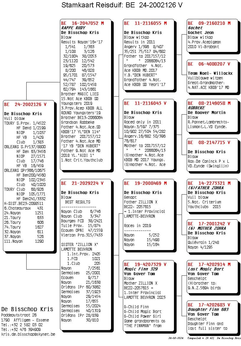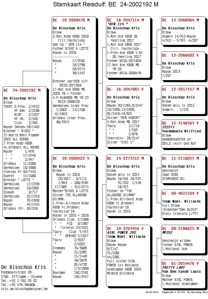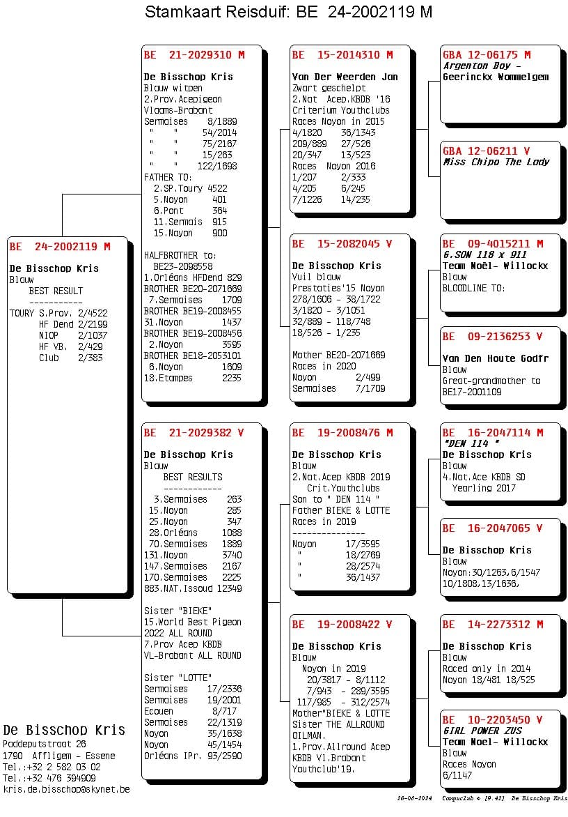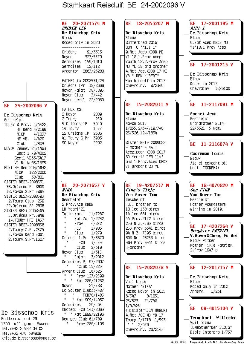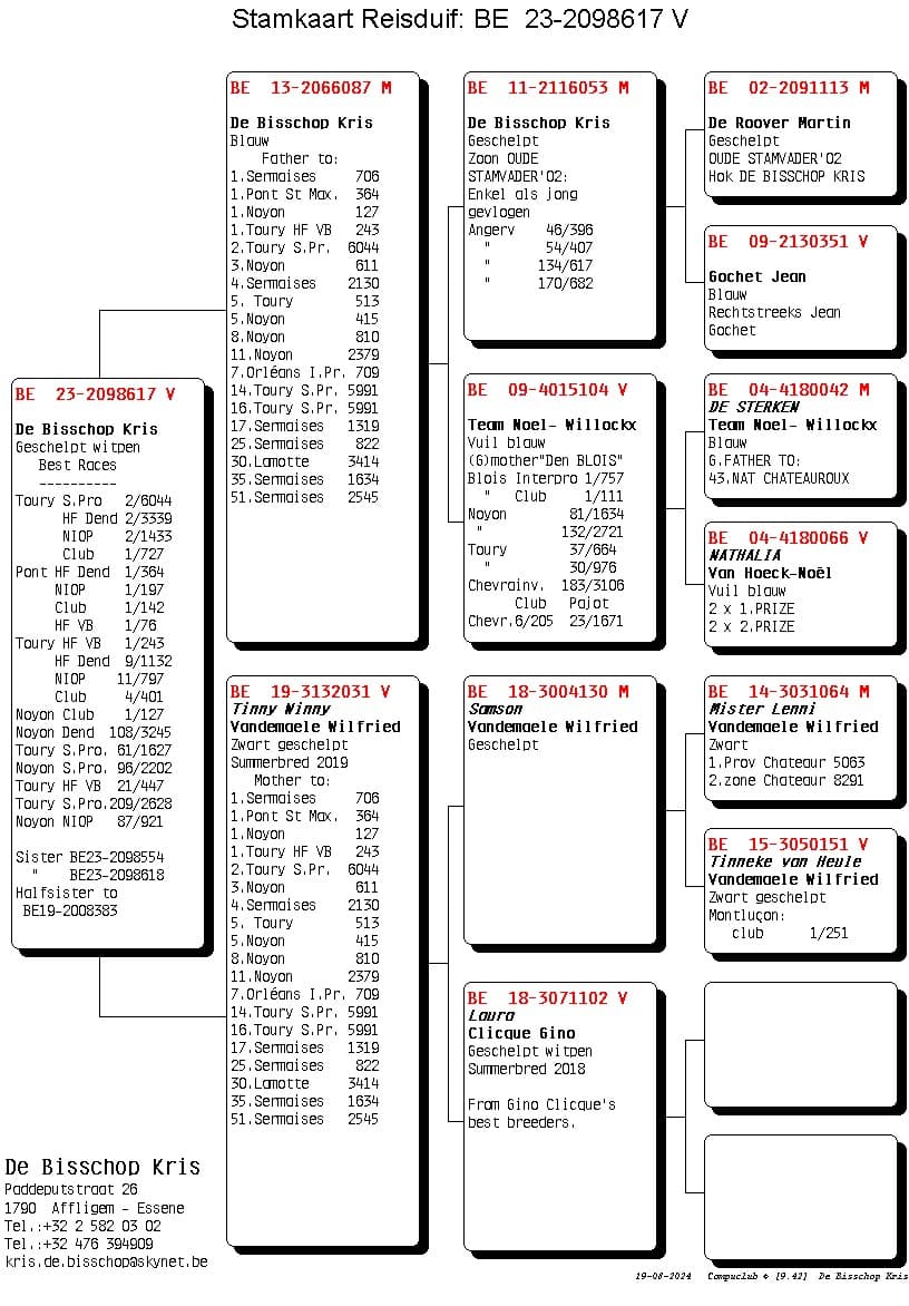 Her mother is “Nina” who won 1st Nat (z) Tulle against 2,232 pigeons. Pure All Round class from 100-600km.