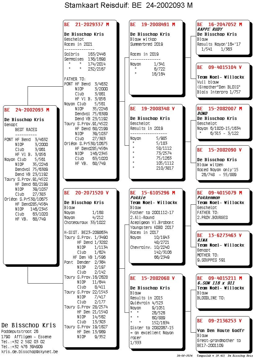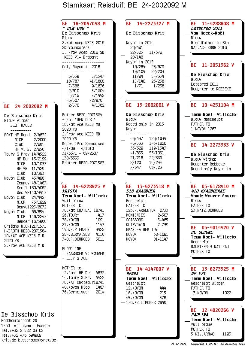 This cock won 1st S.Prov. Pont 4,632p – 9 Noyon 561p – 20 Toury 926p – 27 Orléans 1,020p.