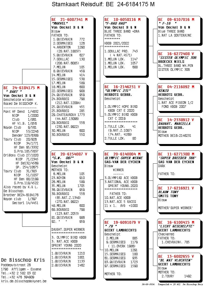 Grandson of super breeder and racer “Olympic Super Werner” 3rd Nat Ace pigeon speed youngsters KBDB 2020 and 3rd Olympic pigeon KBDB 2020.
