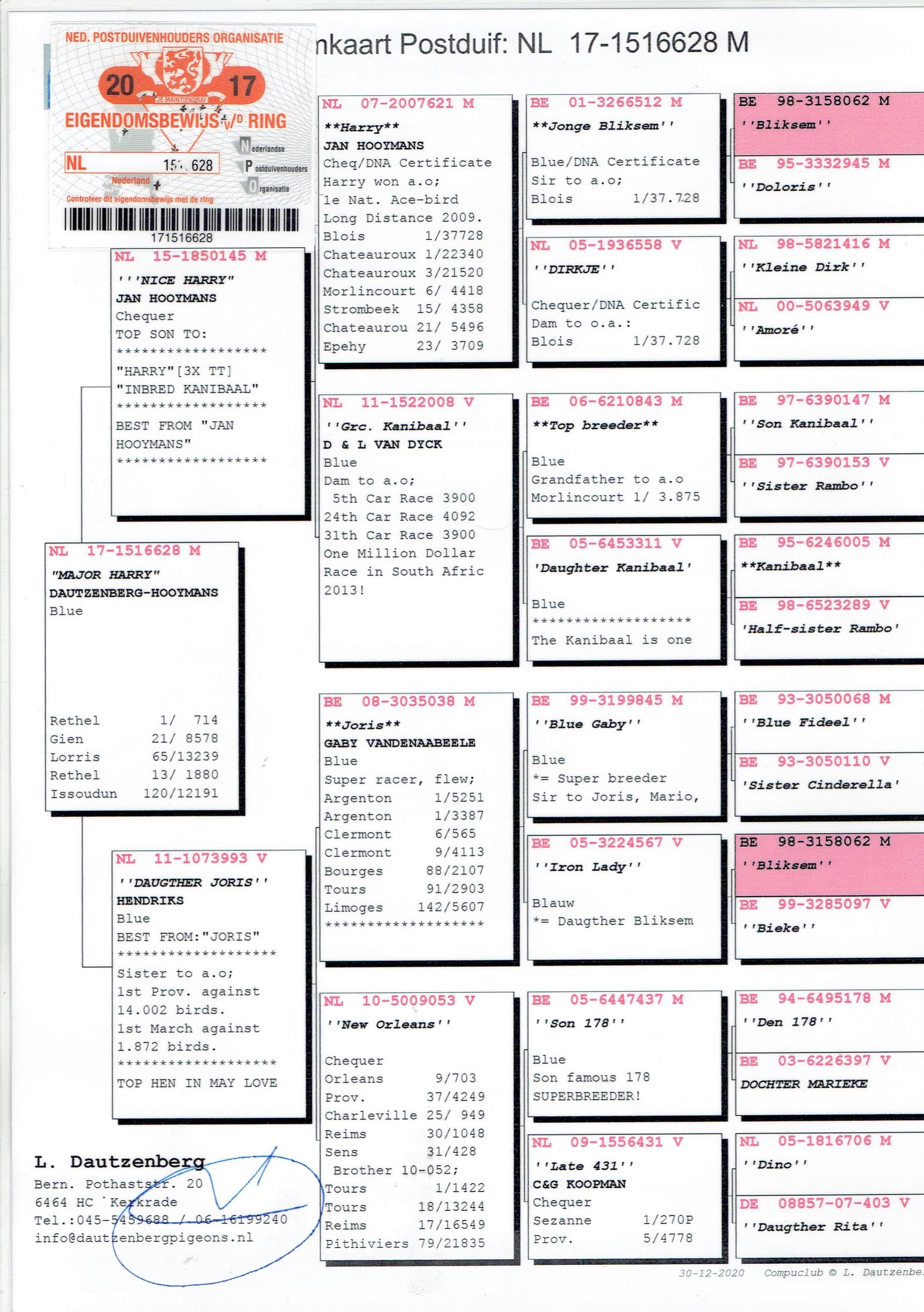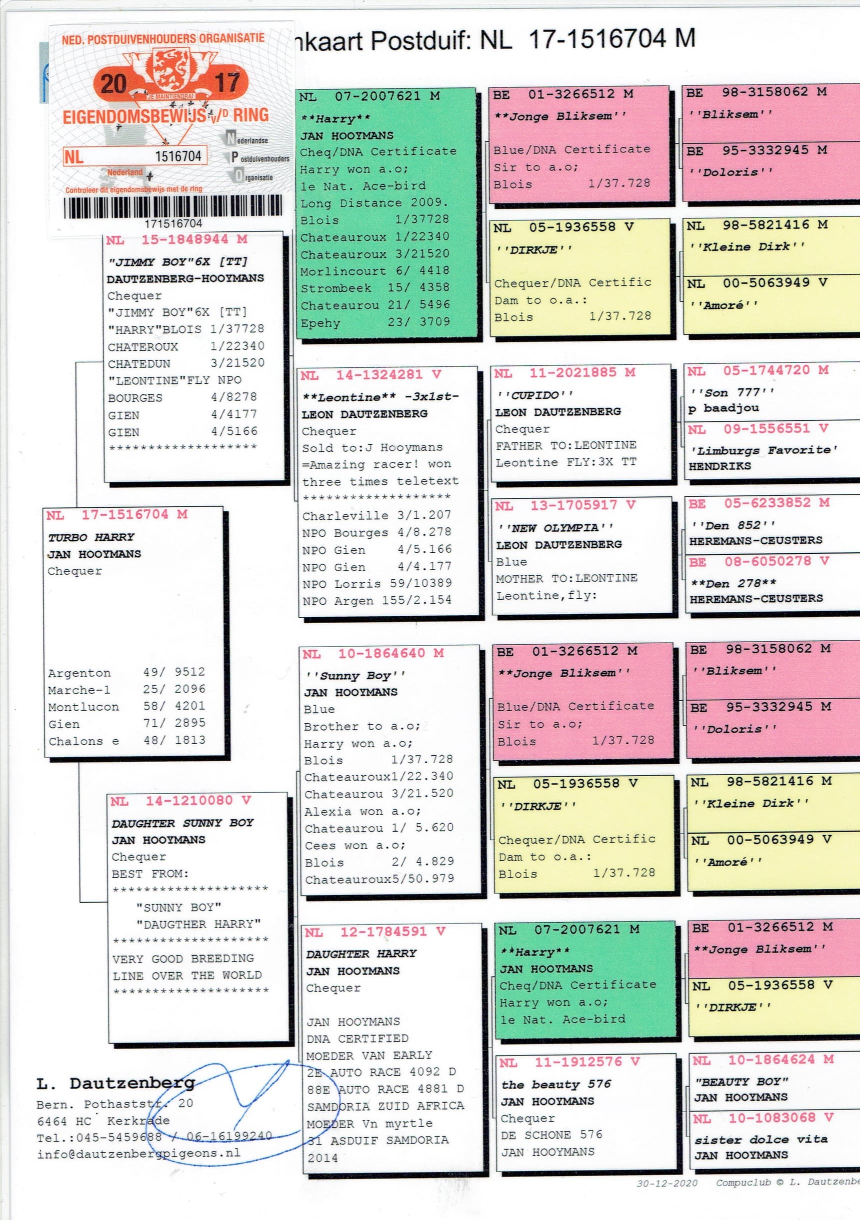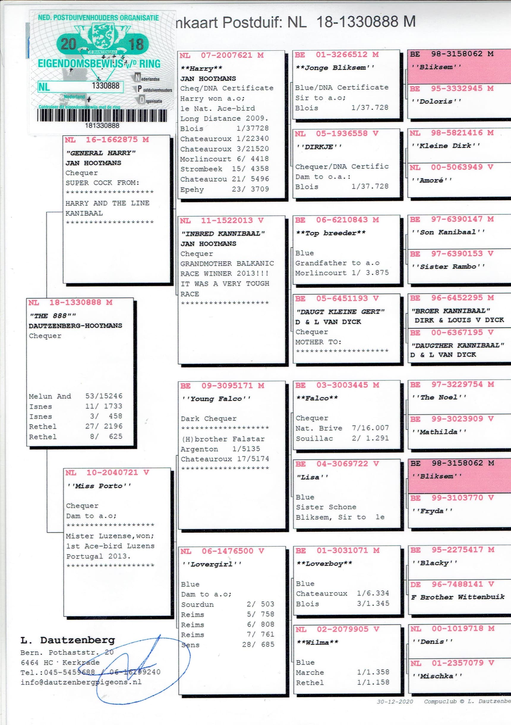 In 2005 and 2008 Leon invested in pigeons from Philip Baadjou (Eygelshoven). A son and a daughter out of the “Donkere 777” (was himself a provincial winner on Orléans and Sezanne) seemed to a hit in the rose. Especially in the pedigree, on father’s side, out of a top hen “Leontien” (won ao.: 4th NPO Bourges 8,278b., 4th NPO Gien 5,166b., 4th NPO Gien 4,177b.) we find this superior breeding line.