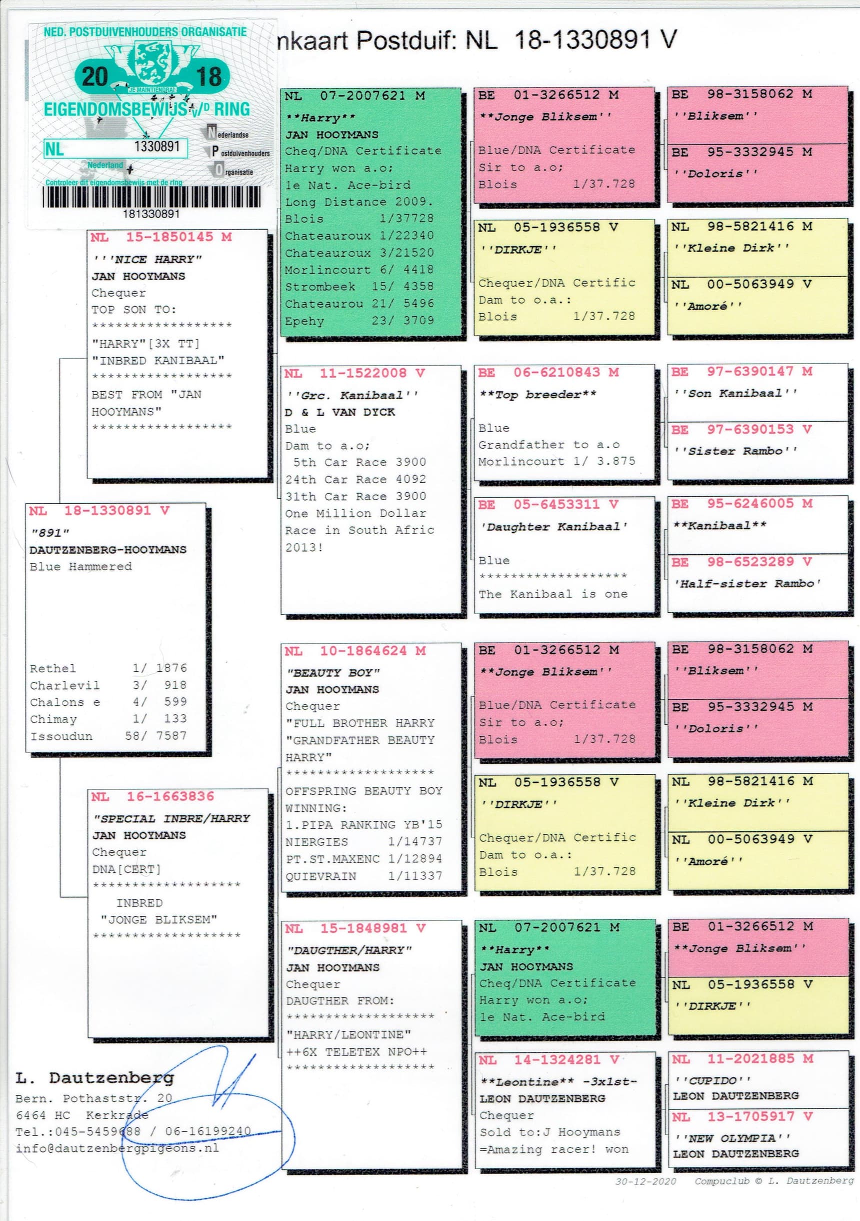 And then…2009…during a sale in Thorn Leon bought the “400” from Jan Hooymans (Kerdriel). “De 400” became afterwards father to the 1st Provincial Limoges “Janine”. A sign for Leon to invest more in direct Jan Hooymans pigeons and now children out of “Harry” x “Kannibaaltje”, “Davinci”, “Broer Harry”, “James Bond” went direction Kerkrade. Juicy detail…Jan Hooymans got the former mentioned top hen “Leontien” in Kerkrade and was coupled in Kerkdriel against “Harry” and “Broer Harry”. A proof that Jan could trust fully in the top quality of Leons’ pigeons.