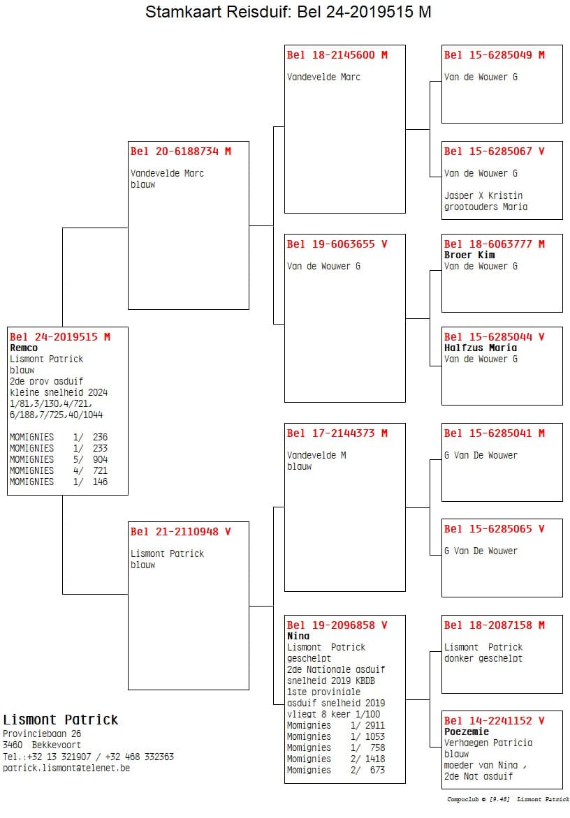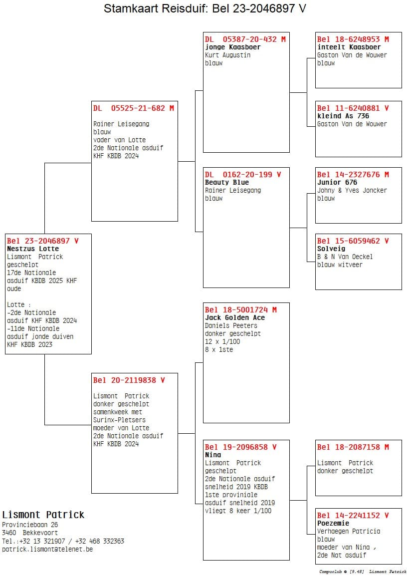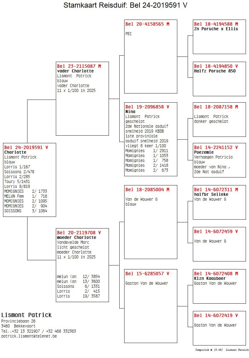As is customary every year, the colony of Patrick Lismont and his wife Sonja is found among the national champions. Their preference is for cocks in the sprint races and hens in the middle distance. As a result, they have already managed to secure multiple championships, and last season they also won the “Golden Ace Middle Distance” in the Herbots Championship with their super hen “Charlotte”. She flew no less than 8 times in the top 100 in the middle distance and 3 times in the top 100 in the sprint races, which did not count towards our championship. Sadly, this hen is no longer with us; on the second race of the 2026 season, she was the only pigeon from the entire loft to go missing. A hard blow for this racing team, as everyone knows that such top performers are few and far between. Furthermore, we are pleased to introduce this colony and their system to you, along with other top performers from this colony, where you should take a close look at the pedigrees, particularly at top hen “Nina”. This hen was 2nd National Ace Pigeon Speed ​​KBDB Young Birds in 2019 and was not sold; she is now performing fantastically in the breeding loft, with several super pigeons, especially in the second generations, passing on her genes in the racing loft.