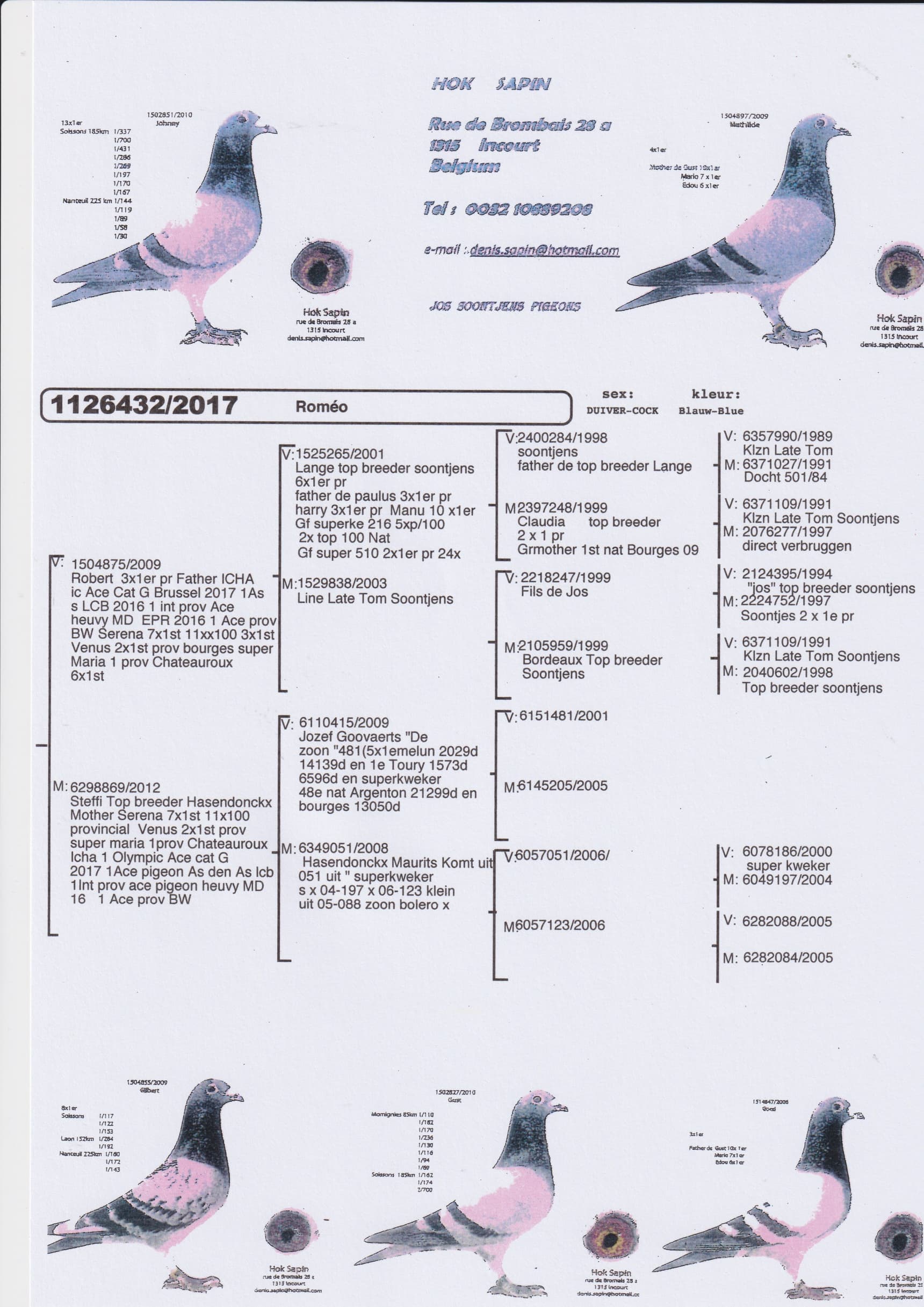 A few years ago (2013) you couldn’t beat top hens ‘Venus’, ‘Maria’ and ‘Serena’. They won on a weekly base first prizes one after the other. Two years later ‘Icha’ was born, this classful hen became 1st Olympiad bird Cat. G Brussels 2017 and also in 2015 ‘Samuel’ was born. He crowned himself later as 9th Olympiad bird Cat. A 2019 and 10th National Ace bird Short Distance old KBDB 2018. In the meantime ‘Venus’ became mother to two super hens namely ‘Eva’ and ‘Morgane’ who raced especially well on the greater middle distance races and ‘Serena’ became mother to ‘Victor’. The topper with 3 national ace bird titles in 2018-2019 and 2020. The last top pigeon at the Sapin loft became ‘Romeo’ who won the title of 1st National Ace bird Short Distance KBDB 2020. An unique couple that you find seldomly and on top of that give their good genes to children of them.