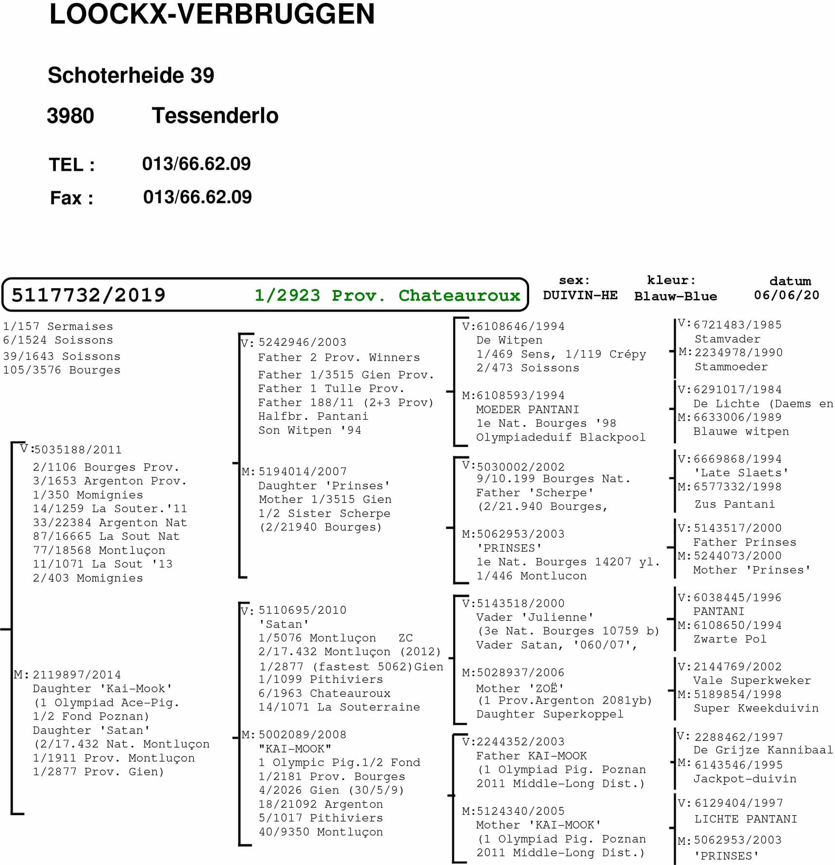 Her mother comes out of a pairing Satan (2 x 1st Provincial and 2nd National Montluçon) x Kai-Mook (1st Olympia pigeon Poznan).