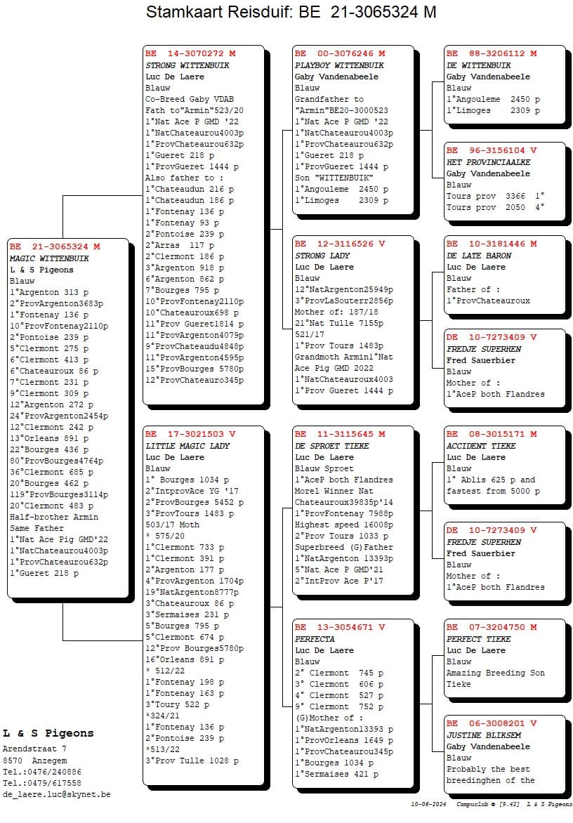 The second provincially clocked pigeon, the blue cock BE21-3065324 "Magic Wittenbuik", on the same national flight Argenton but in the old pigeons category last weekend was also a grandchild of "Sproet Tieke", as well as a half-brother of "Armin", the first National Ace pigeon G.M.D. 2022 as well as the 1st Nat. Châteauroux winner against 4,003b.