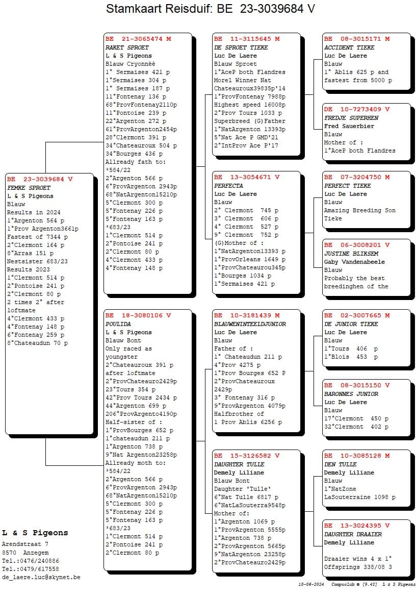 This weekend, Luc De Laere achieved his 51st provincial victory. Just a few weeks after congratulating Luc on his 50th provincial win, he strikes again! With BE23-3039684 "Femke Sproet," a grandchild of the famous "Sproet Tieke," he won first place among yearlings in the provincial Argenton race in West Flanders against 3,661 yearlings (and fastest of 7,344 pigeons). It was a tense moment at the De Laere household as "Femke Sproet" flew around for about two minutes before landing on the board.