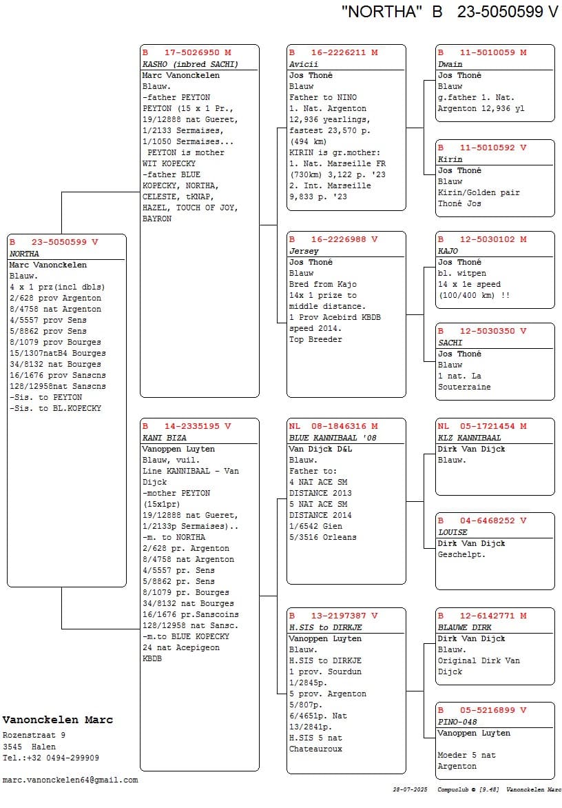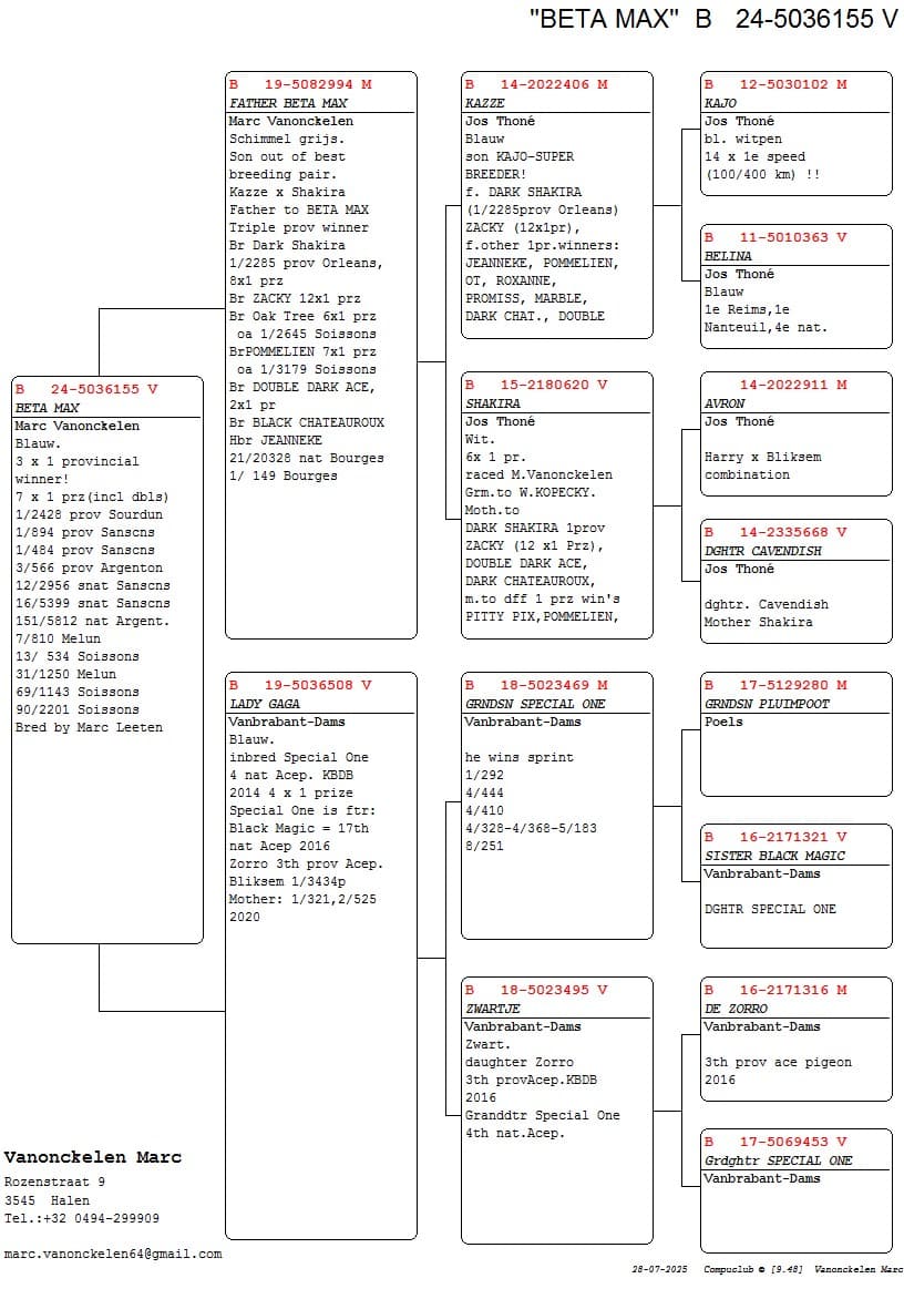 Son of “206/14” Kazze is son of superstar “Kajo” 14 x 1st x “620/15” Shakira won 6 x 1st and is grandmother of “White Kopecky” 1 Prov Ace Pigeon heavy middle distance KBDB 2023 with among others 1 Prov Bourges 1,645p (2nd Nat 9,922p) – 16 Nat Bourges 12,094p