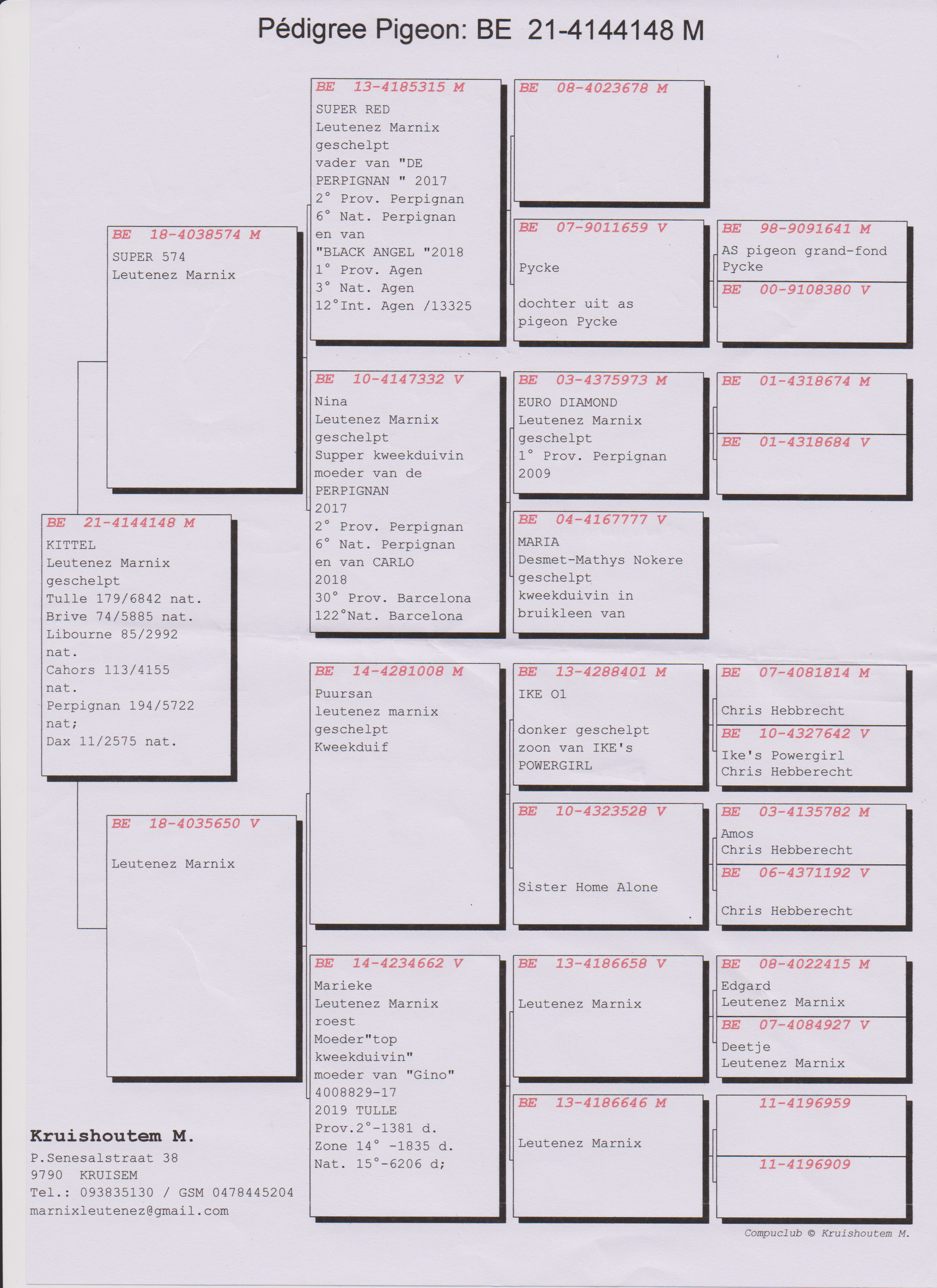 His father comes from the old lines of the pigeons Pijcke and Euro Diamond. His mother is a cross between pigeons from Chris Hebberecht and Marieke's own kind. In the past he already flew 178th nat Tulle, 74th nat Brive, 85th nat Libourne, 11th nat Dax, 113th nat Cahors, 194th Perpignan, in other words a pigeon with a very strong record.
