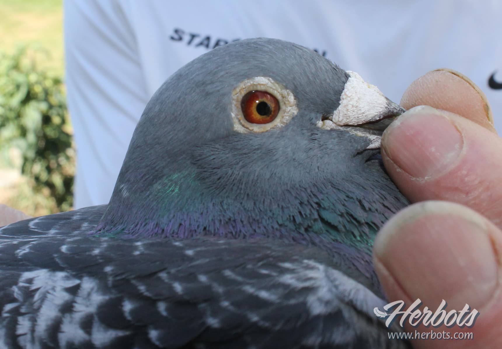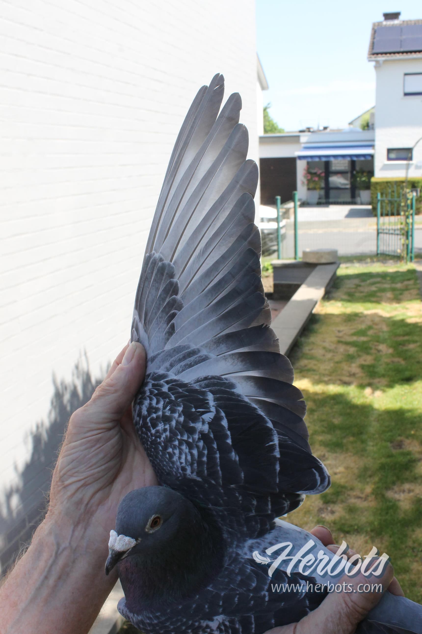 It is a beauty in the hand, strong pigeon, soft plumage and a very expressive eye. This 4-year-old cock has a little story around him because in 2024 he flew himself to pieces against a window at the back of the house. Marnix picked him up as dead, the pigeon was unconscious and only regained consciousness after a few minutes. It was a matter of waiting to see what would happen and whether there would be any internal injuries. After a few days everything started moving again and he became the playful normal pigeon of the past again... with strong results as a result.