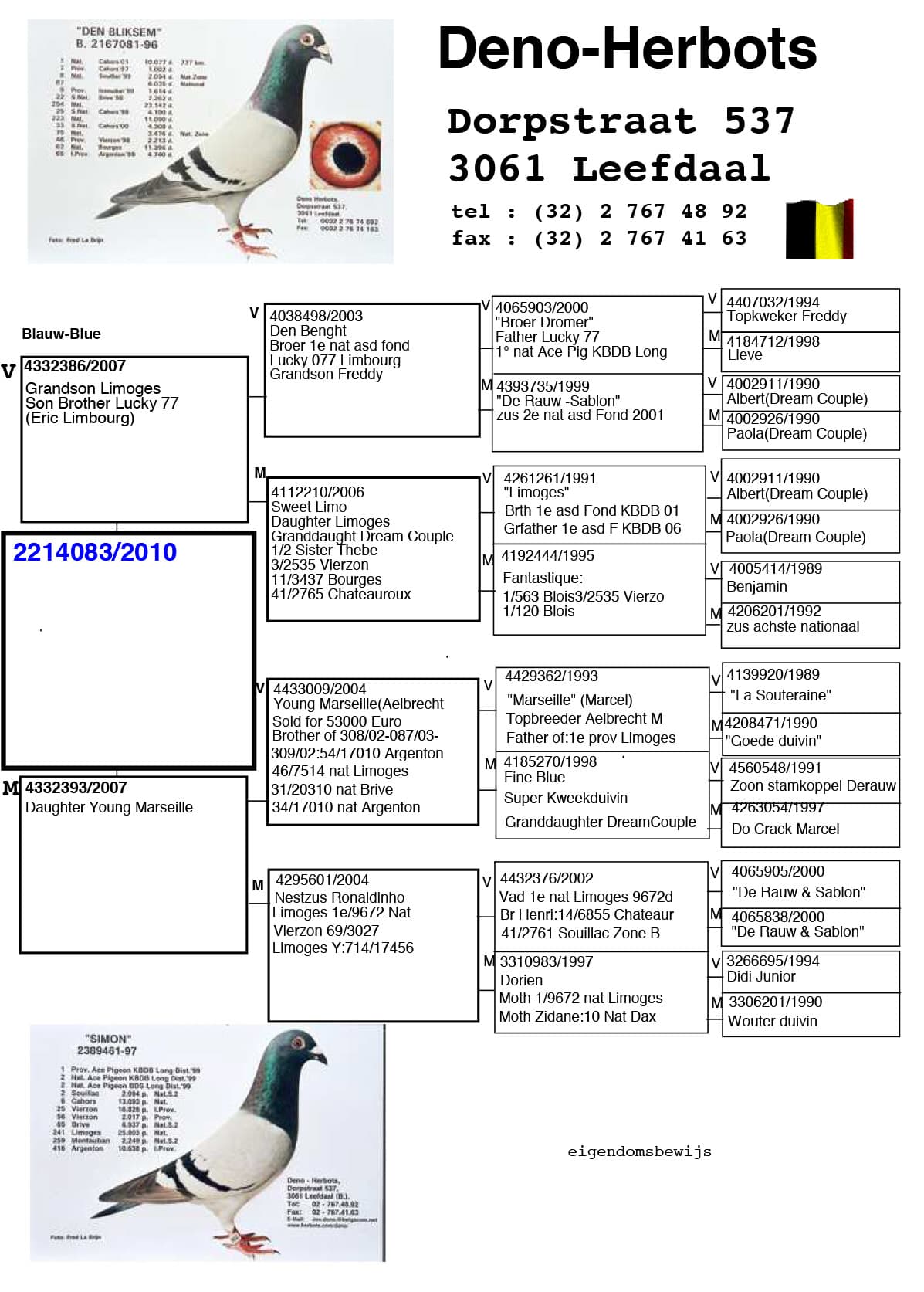 Belg 10 2214083 has bred generations of One Loft winners with a direct daughter winning the Empire Classic in Canada on a very tough day with only three birds on the drop. The Empire Classic Winner has bred many top pigeons including Big Andy's One Loft Race 451 miles in 2019. The Big Andy 451 mile winner then proceeded to breed 1st Hoosier Classic Million Dollar Race 2020. As you can see there are three generations of major One Loft Winners bred from Belg 10 2214083. Another Herbots cock, Belg 10 2215497 also a De Rauw Sablon from Herbots bred 15th Million Dollar Race in 2016 with only 45 day birds along with other winners and equal 1st Car Race winner in the South African Million Dollar Race. The Herbots De Rauw Sablon pigeons have made a big impact in McLaughlin Lofts.