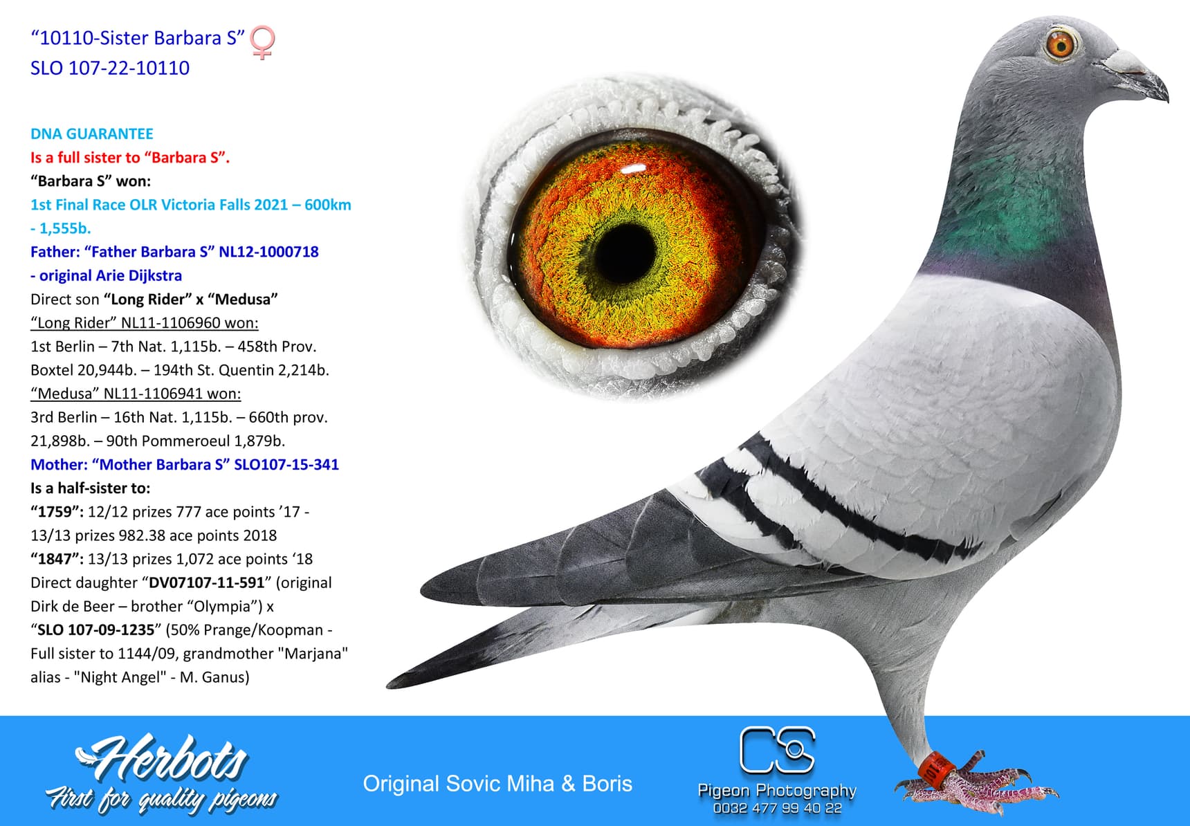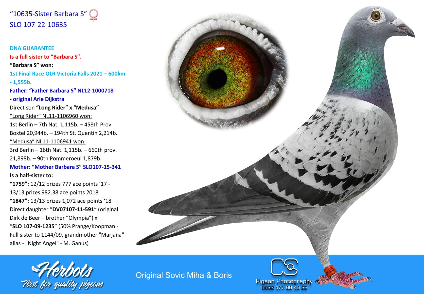 After the Derby Brod FCI OLR the Sovič family participated at another big race, Victoria Falls, Zimbabwe. The 600 km final race, with 1500 pigeons participating on final race, was won by none other than Miha Sovič and his hen "Barbara S". The Sovič name quickley became synonimous with a great loft and incredible OLR results.
