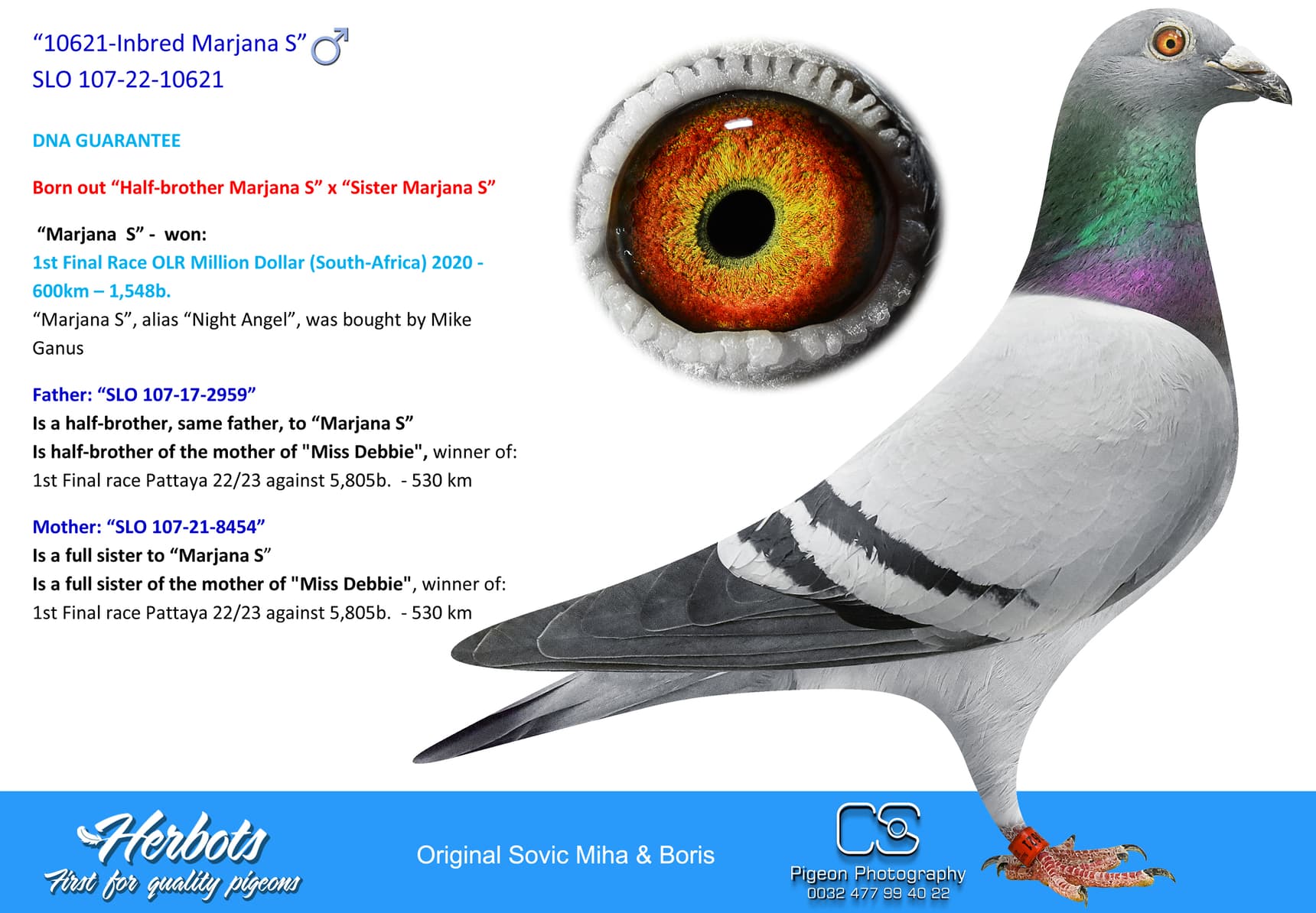 The next step in every successful pigeon fancier story are the references, of which the Sovič family have plenty. The most obvious example for this is the world-famous Mike Ganus loft from the USA, who strenghtened his flock with many original Sovič birds, who repayed him that trust. The newest superstar of the Ganus loft is "Miss Debie", the winner of the Pattaya OLR 530 km final race with 5805 pigeons participating. The mother of "Miss Debie" is the full-sister of "Marjane S" - original Sovič. That same original Sovič hen is also the mother of Mike Ganus's pigeon who won 6th place at Pattaya final race in 2022. Other than that pigeon at the Pattaya FCI OLR: