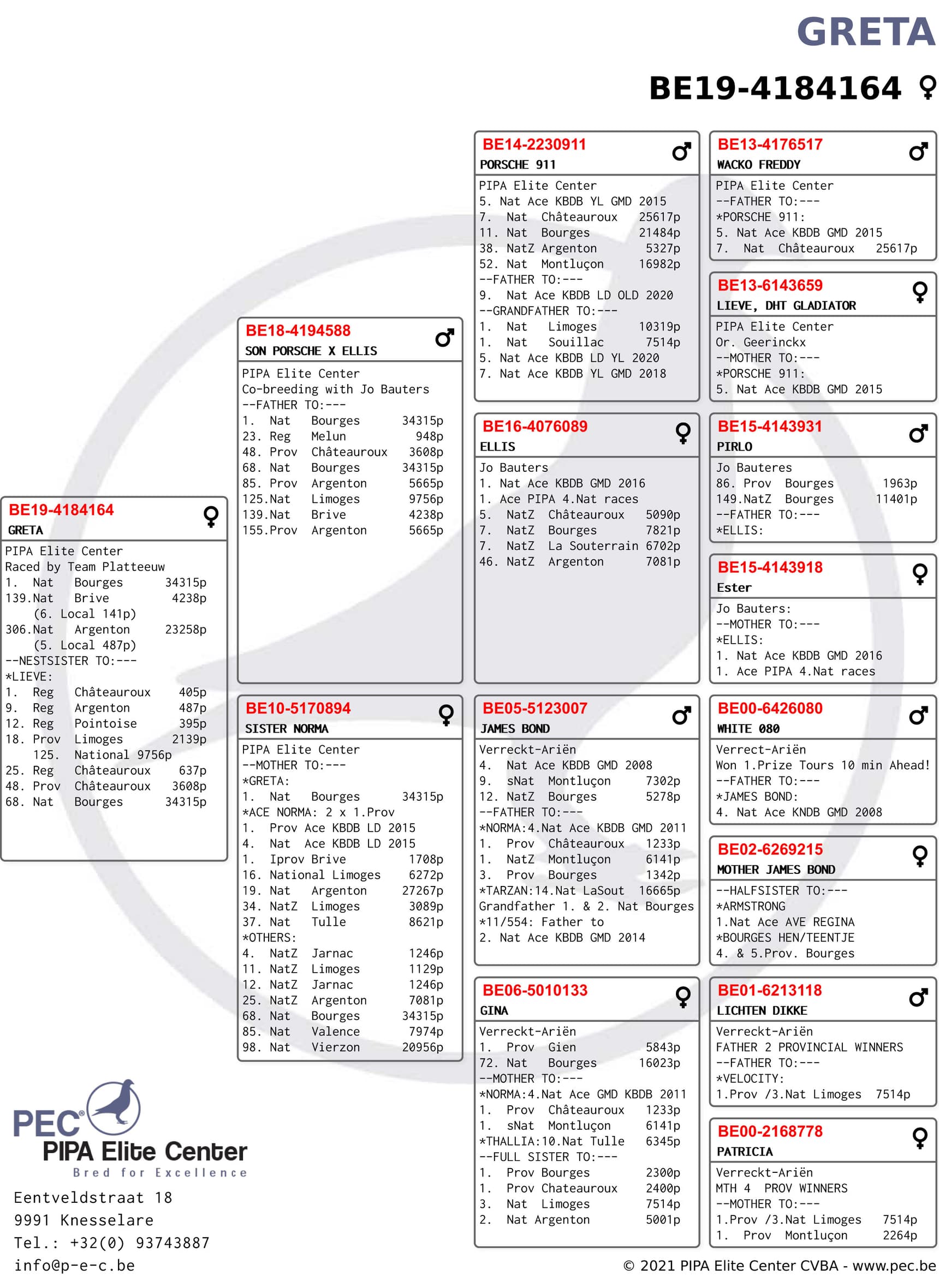 The national winner is called “Greta”. “Greta” (B19-4184164) was bred by Pascal Ariën (PEC) and won already before Bourges the 139th National Brive 4,238b and the 306th National Argenton 23,258b. Her nest sister “Lieve” (B19-4184163) won the past weekend the 68th National Bourges and won the former season also the 125th National Limoges against 9,756 pigeons.