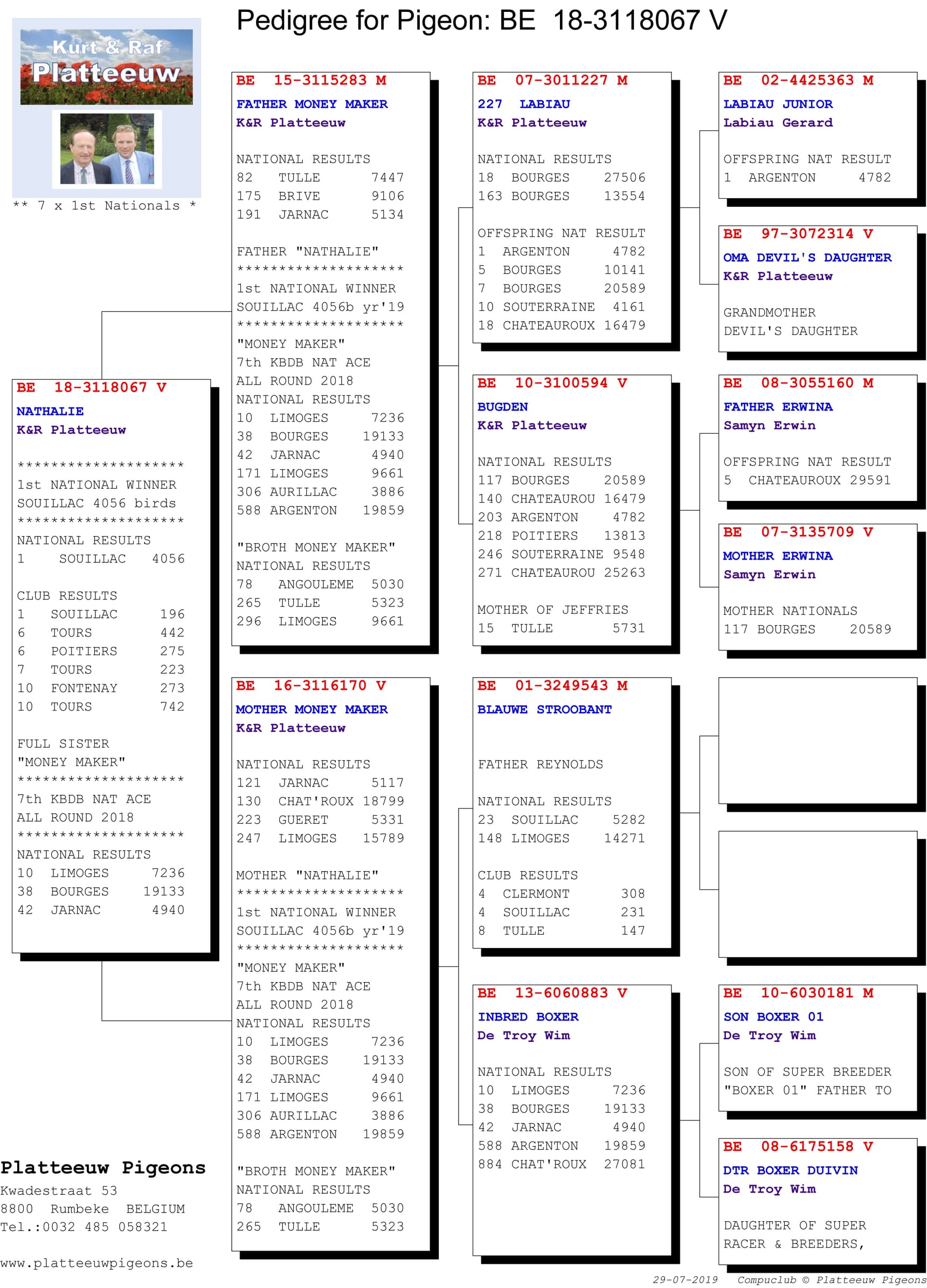 Rumbeke: There isn’t a break at the Platteeuws’ house…the 3rd national victory in 2019 is a fact. Now it was “Nathalie” (B18-3118067) who left the 4,056 year birds behind. Where is this going to end, is what everybody is asking themselves? Not only in a matter of victories but also in a matter of national Ace bird titles the expectations are set high as there are a few serious candidates lining up to win this title of honour. The next national race will make us much smarter concerning the ace bird titles!